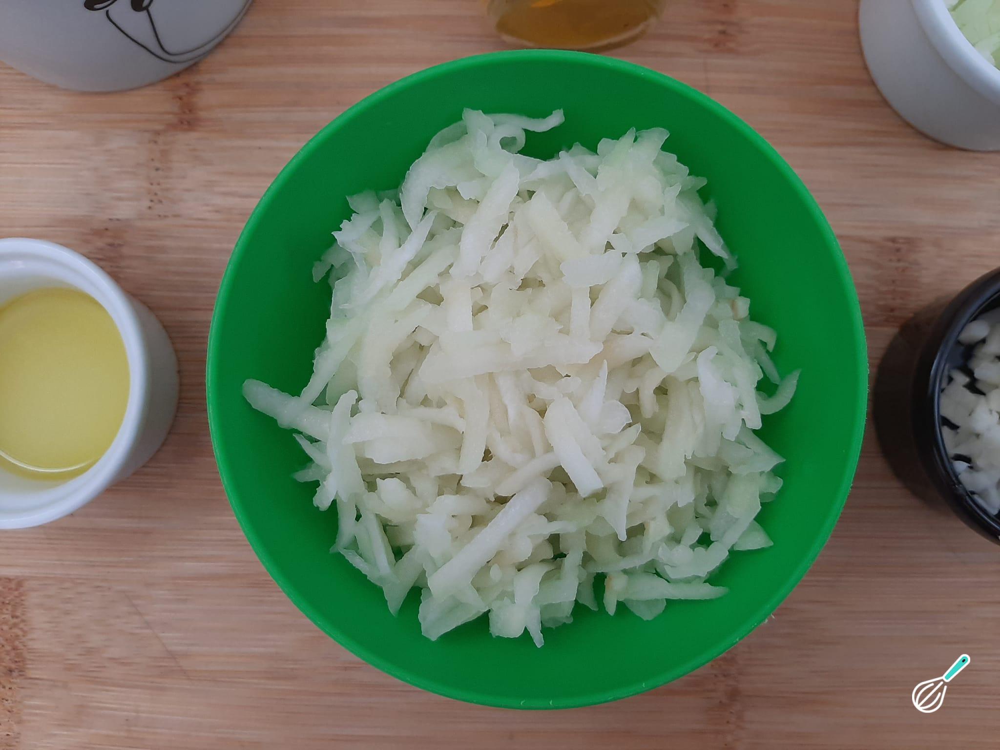 Rale o chuchu cru no ralador grosso e reserve-o.