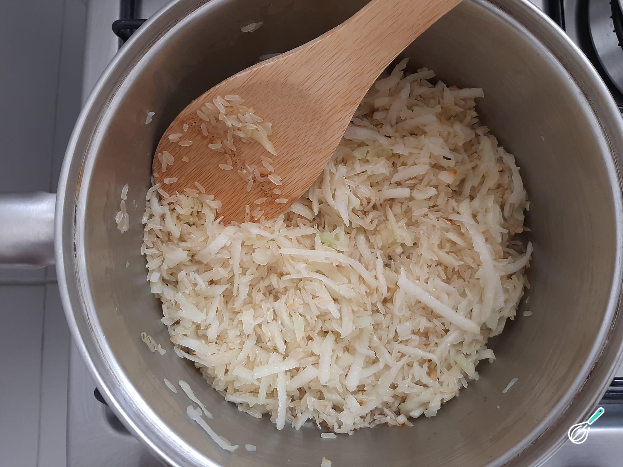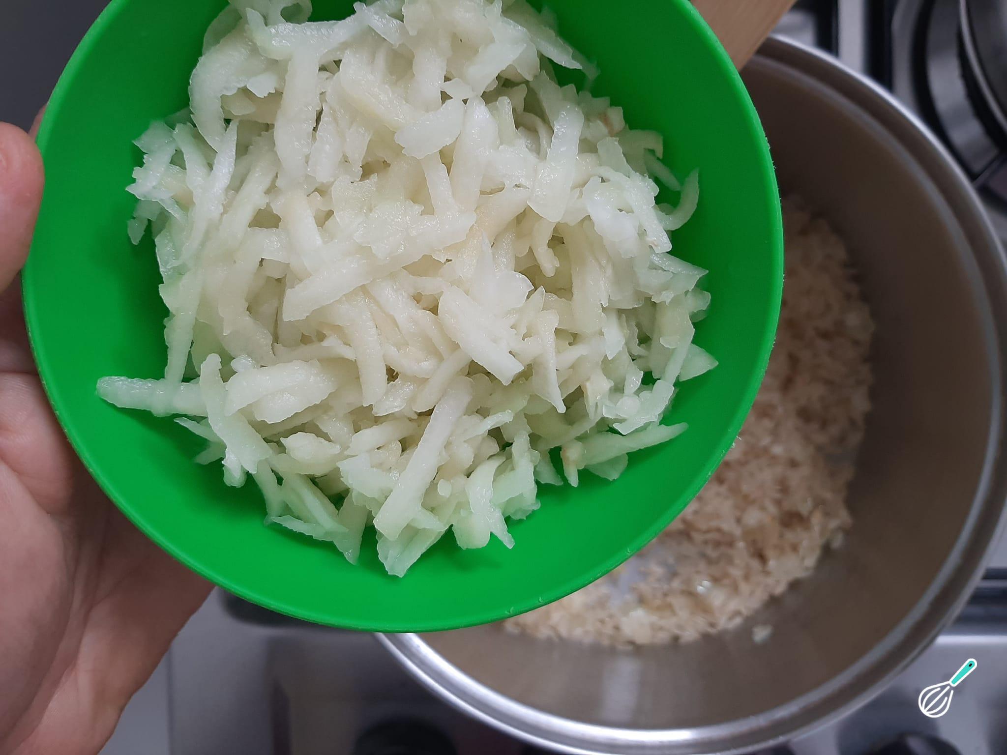 Deixe o arroz fritando um pouquinho no refogado e em seguida, adicione o chuchu ralado.