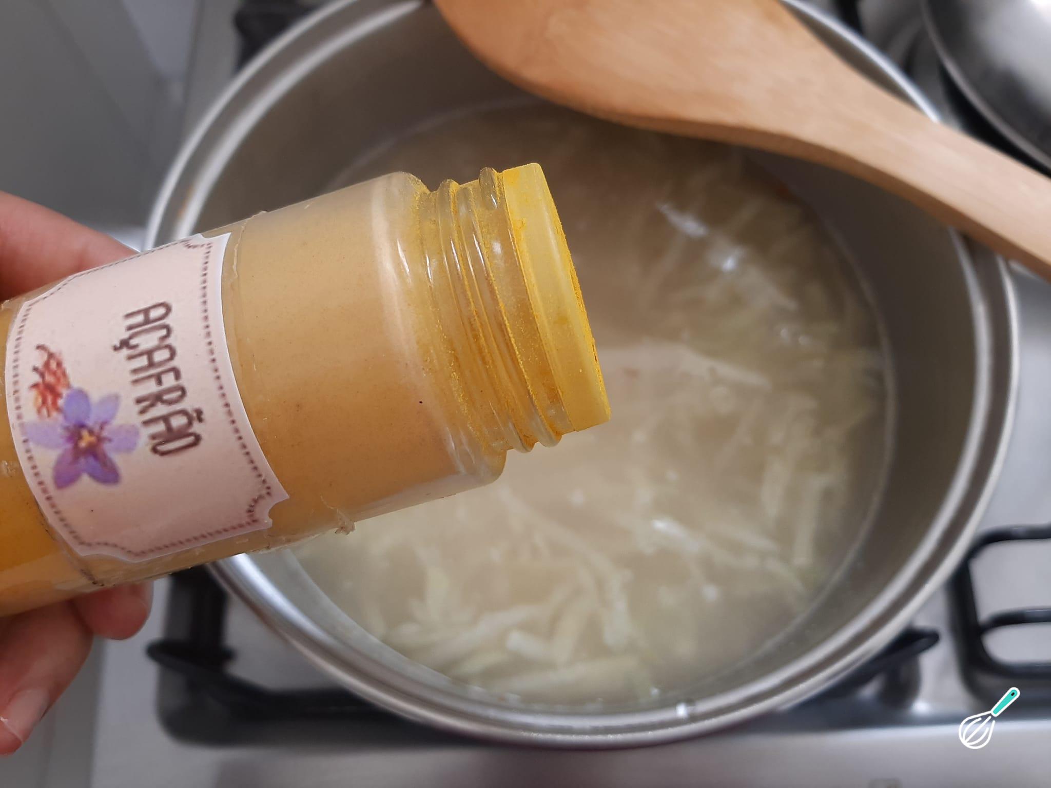 Reduza o fogo e adicione a água quente. Tempere com sal e açafrão, misturando bem.