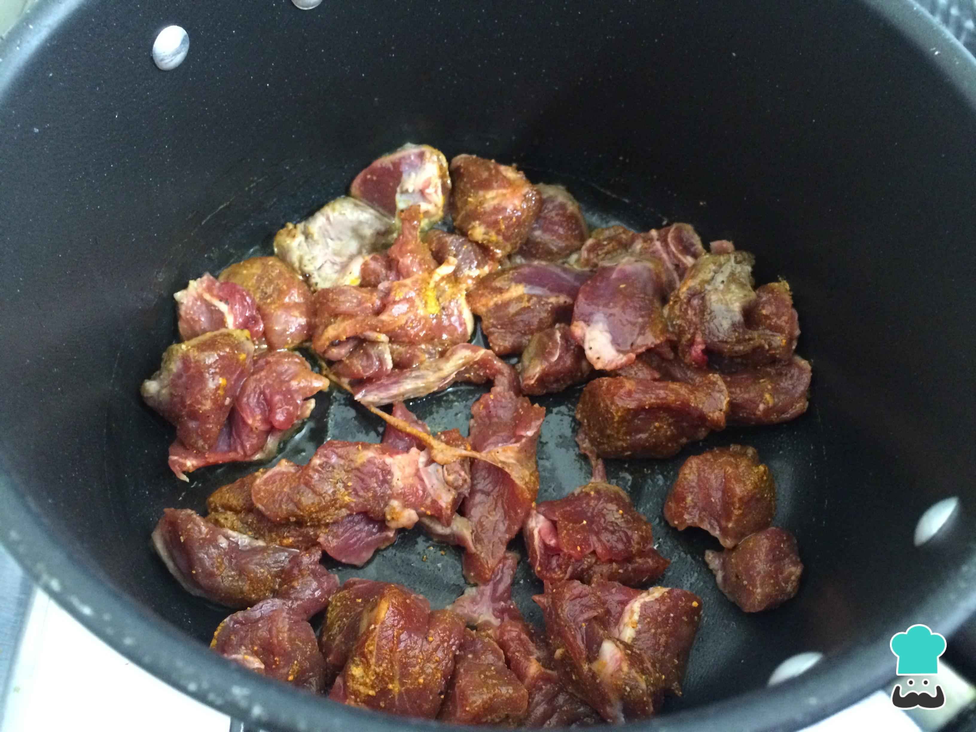 De seguida tempere a carne de cordeiro com sal, pimenta, curry, cúrcuma/açafrão-da-terra e cominho. Leve ao fogo alto uma panela com um pouco de óleo e sele aí a carne, ou seja, cozinhe até ficar dourada de todos os lados, mas ainda crua no interior.