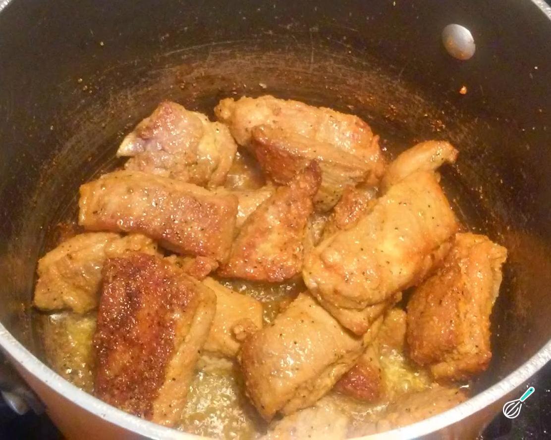 O primeiro passo dessa receita de arroz e costelinha na panela de pressão é refogar a costelinha, cortada em pedaços, na panela de pressão com óleo ou azeite.