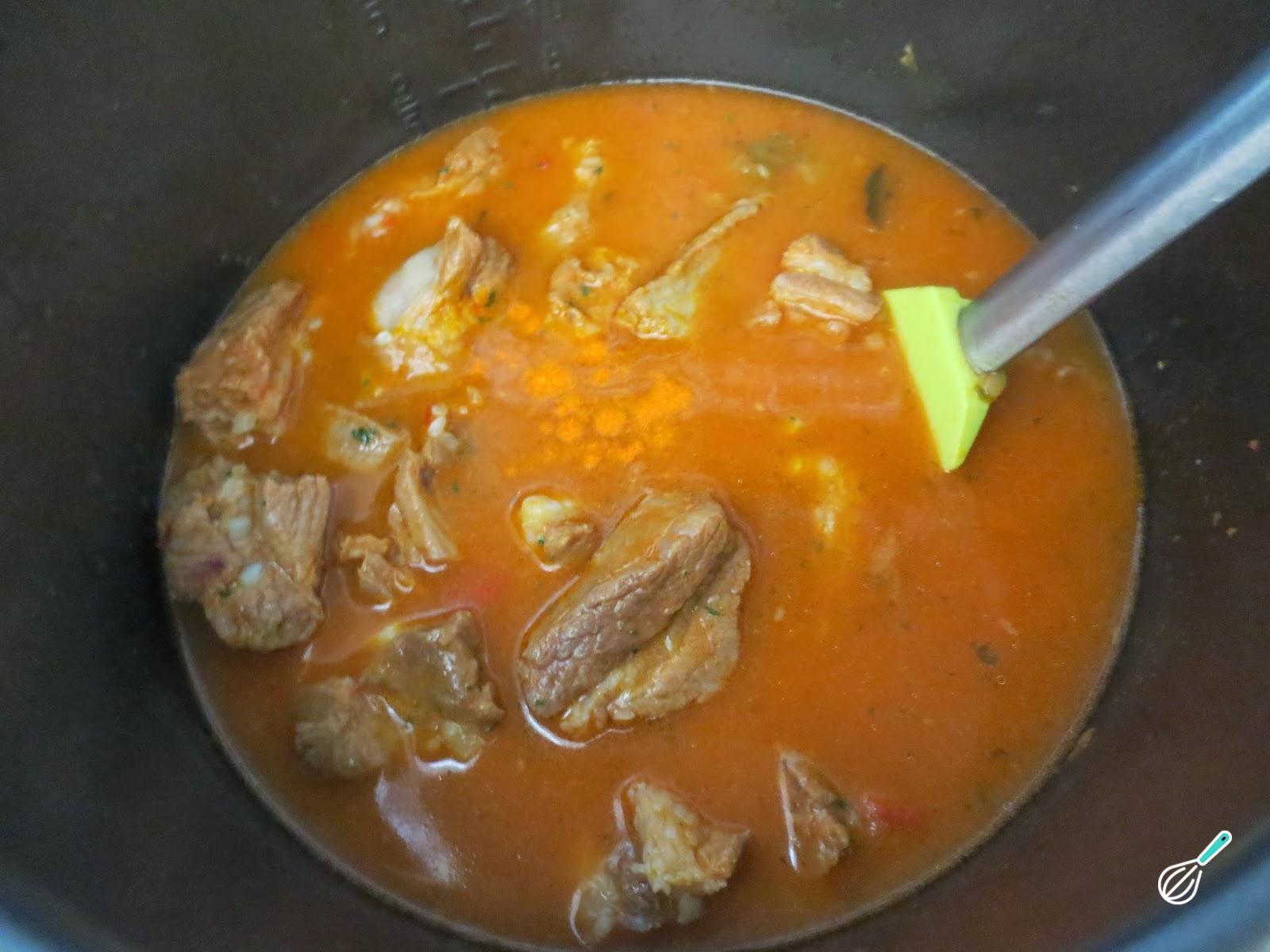 Quando a carne estiver bem douradinha junte o tomate e água até cobrir, tampe e deixe pegar pressão no fogo alto. Depois baixe o fogo, deixe cozinhar por mais 15 minutos, desligue e espere a pressão sair. Abra a panela, adicione o alho, a cebola, o pimentão e o shoyu e misture.