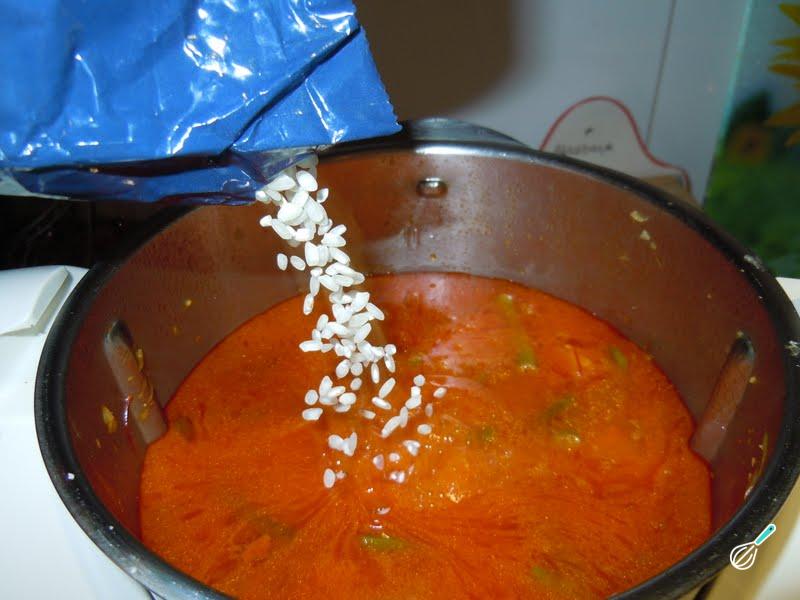 Cozinhe no fogo baixo por uns 10 minutos, mexendo de vez em quando, e finalmente adicione o arroz. Cubra com água, prove e, se necessário, acerte o sabor com sal. Tampe novamente e, assim que pegar pressão, baixe o fogo e cozinhe por 6 minutos. Desligue e espere a pressão sair naturalmente.