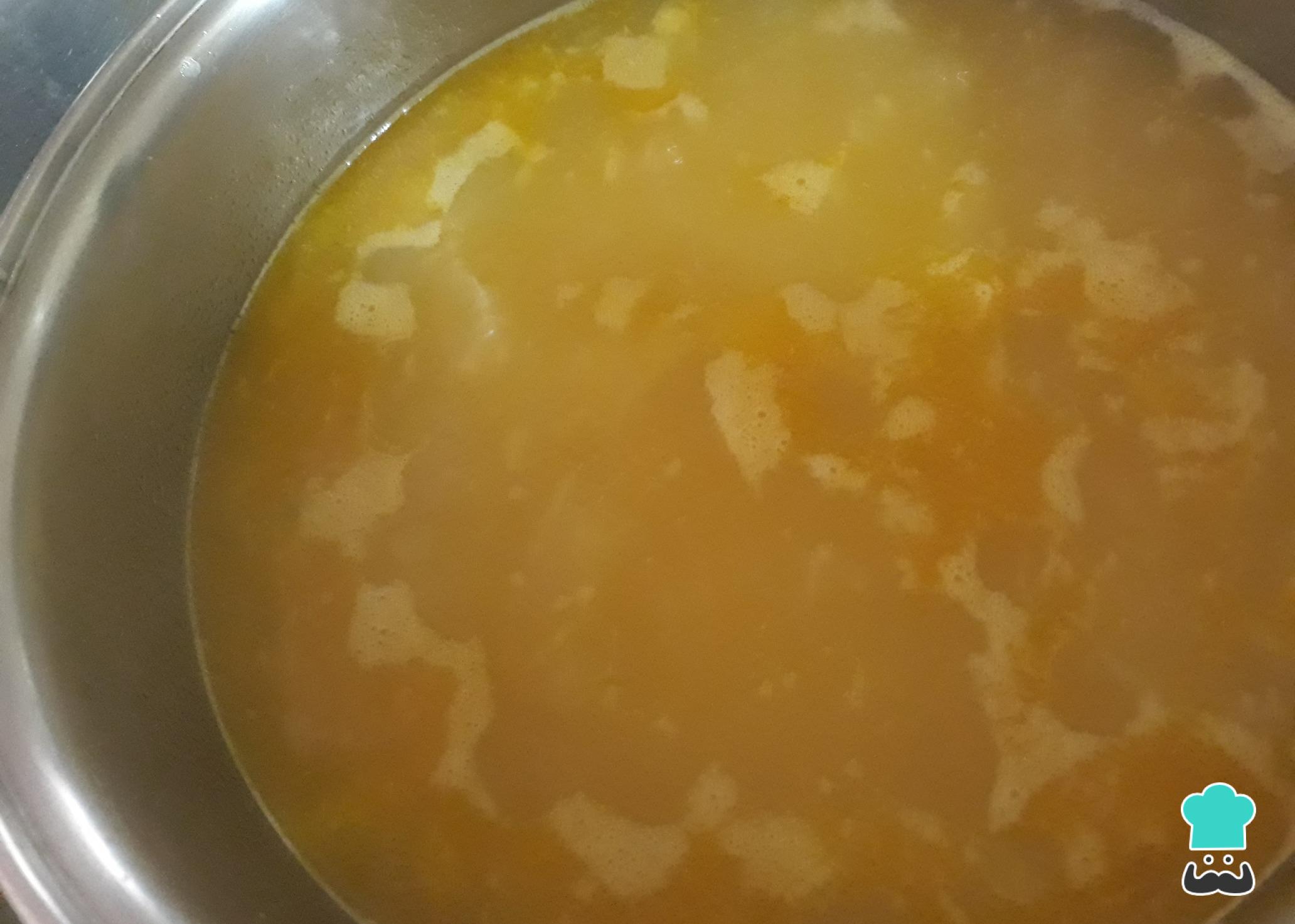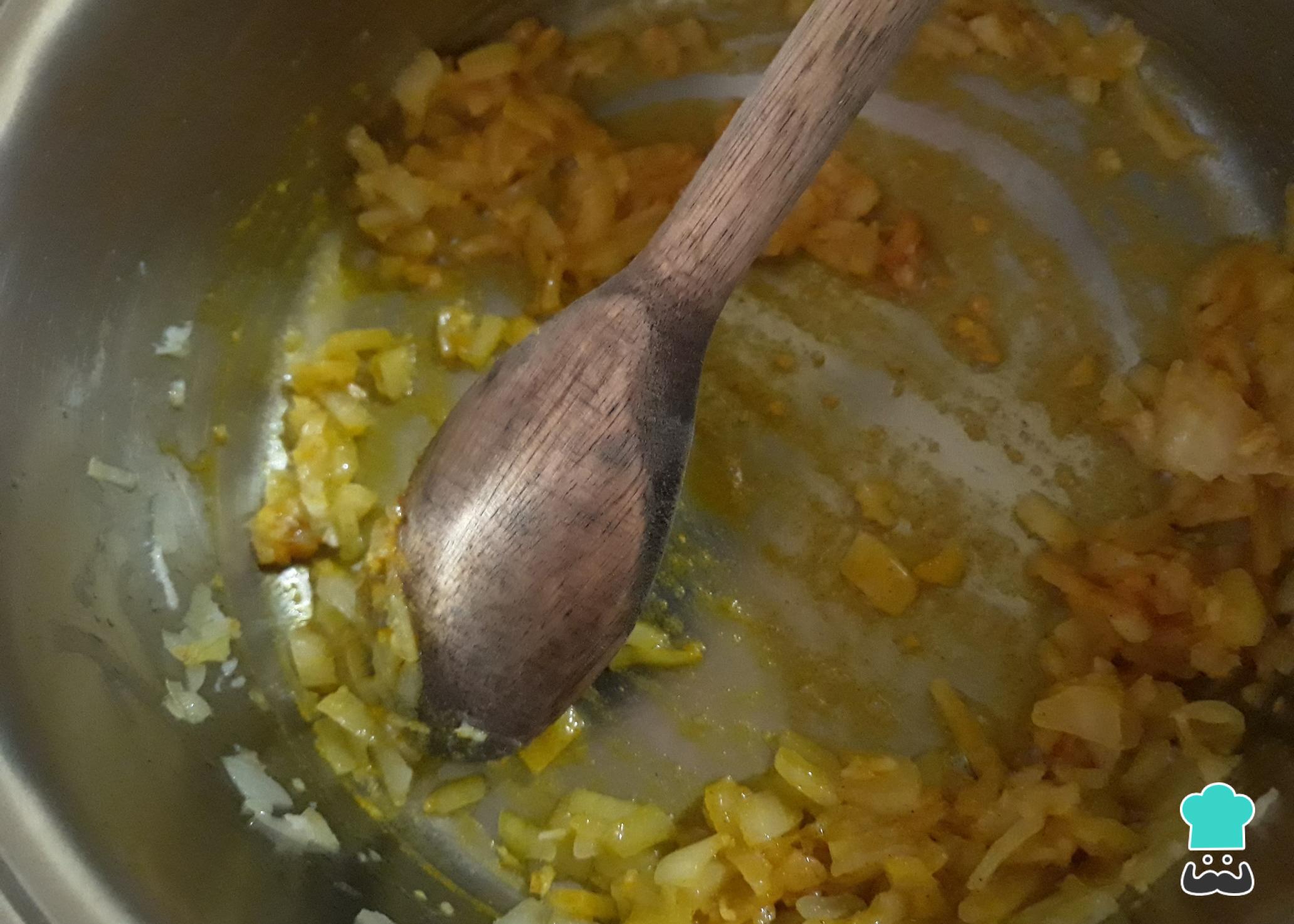 Em uma caçarola coloque o azeite, o alho amassado e a cebola. Ligue o fogo, refogue até a cebola ficar transparente e acrescente a cúrcuma.