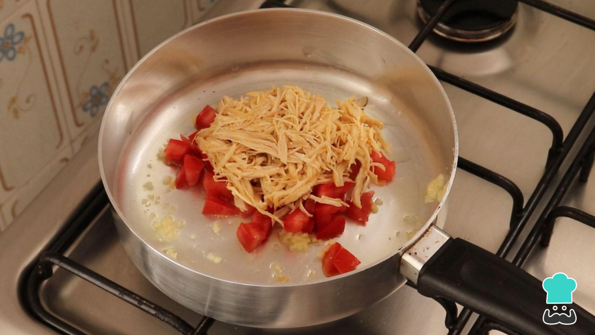 Leve uma panela ao fogo médio, adicione um fio de azeite e doure o alho. Junte o tomate e refogue por 1 minuto. Junte o frango cozido e desfiado e misture bem.