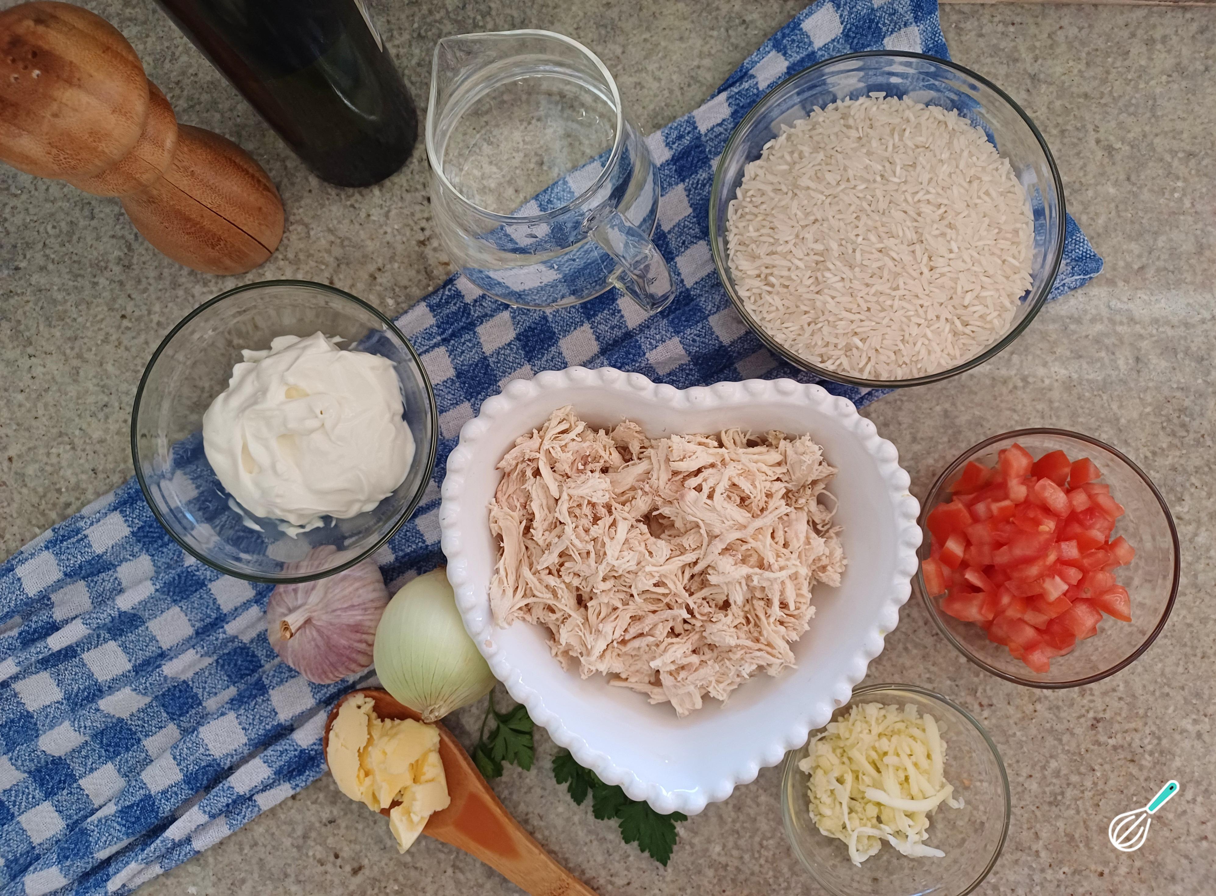 Separe os ingredientes para fazer seu arroz com frango cremoso.