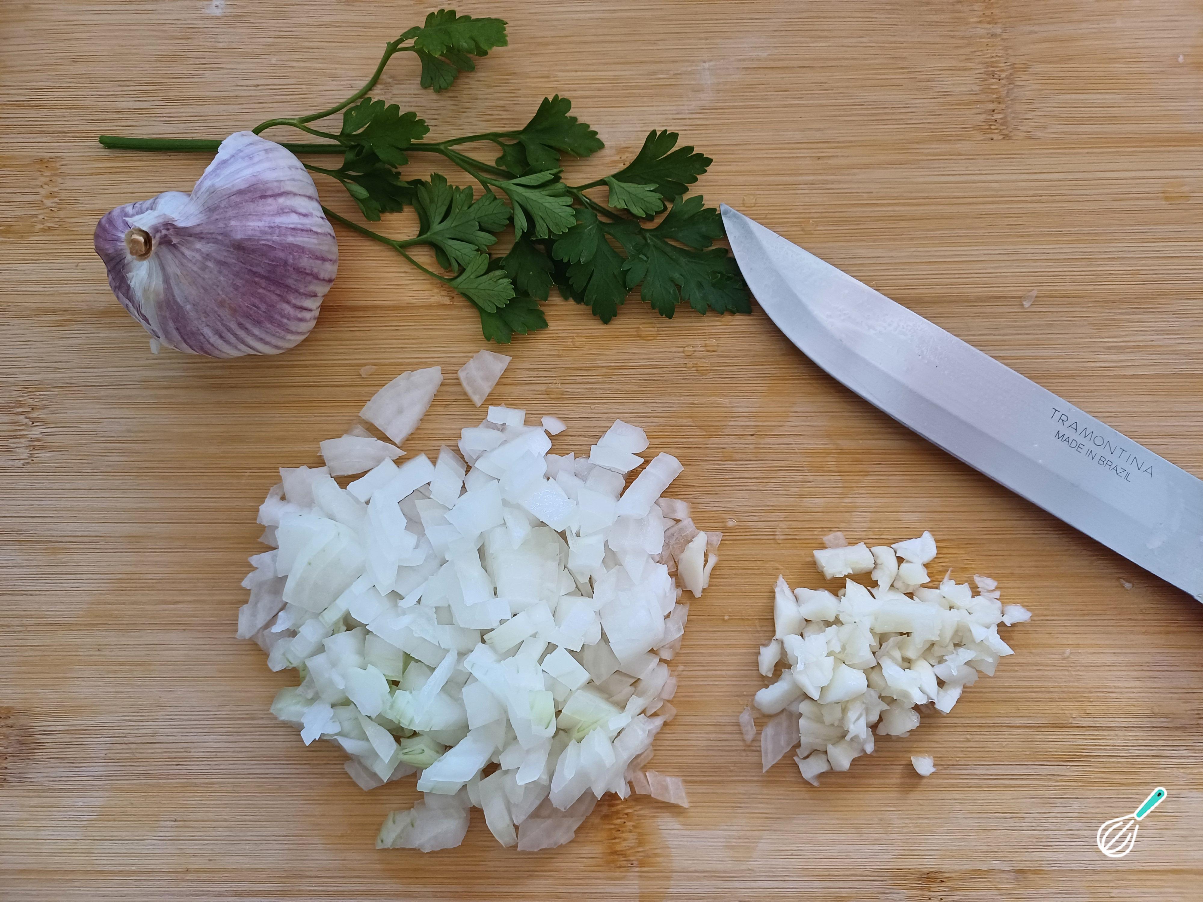 Pique bem a cebola, triture o alho. Corte o tomate em cubos pequenos, sem a semente. Reserve.