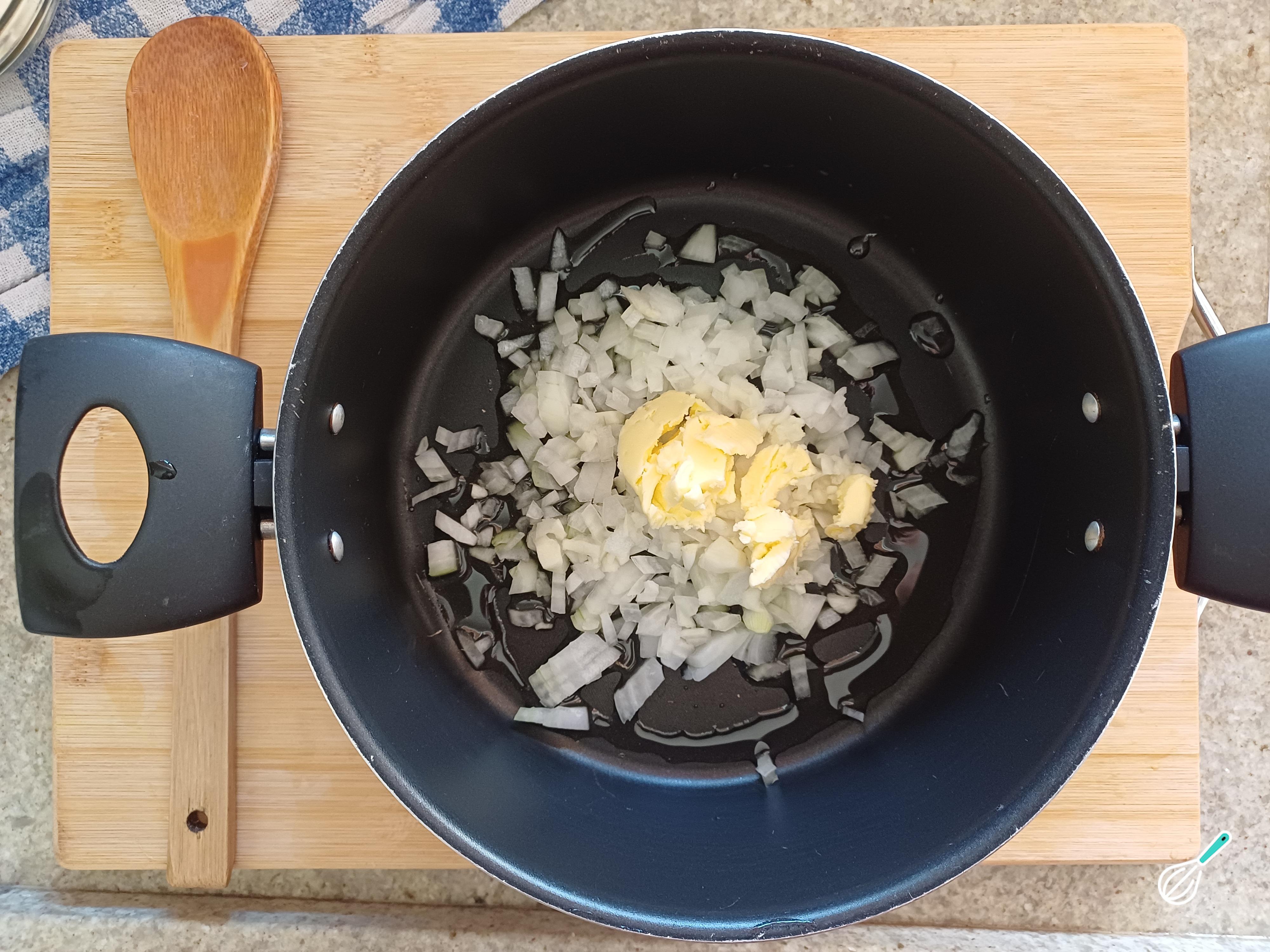 Em uma panela adicione a manteiga, o azeite e doure rapidamente a cebola picada e o alho triturado.