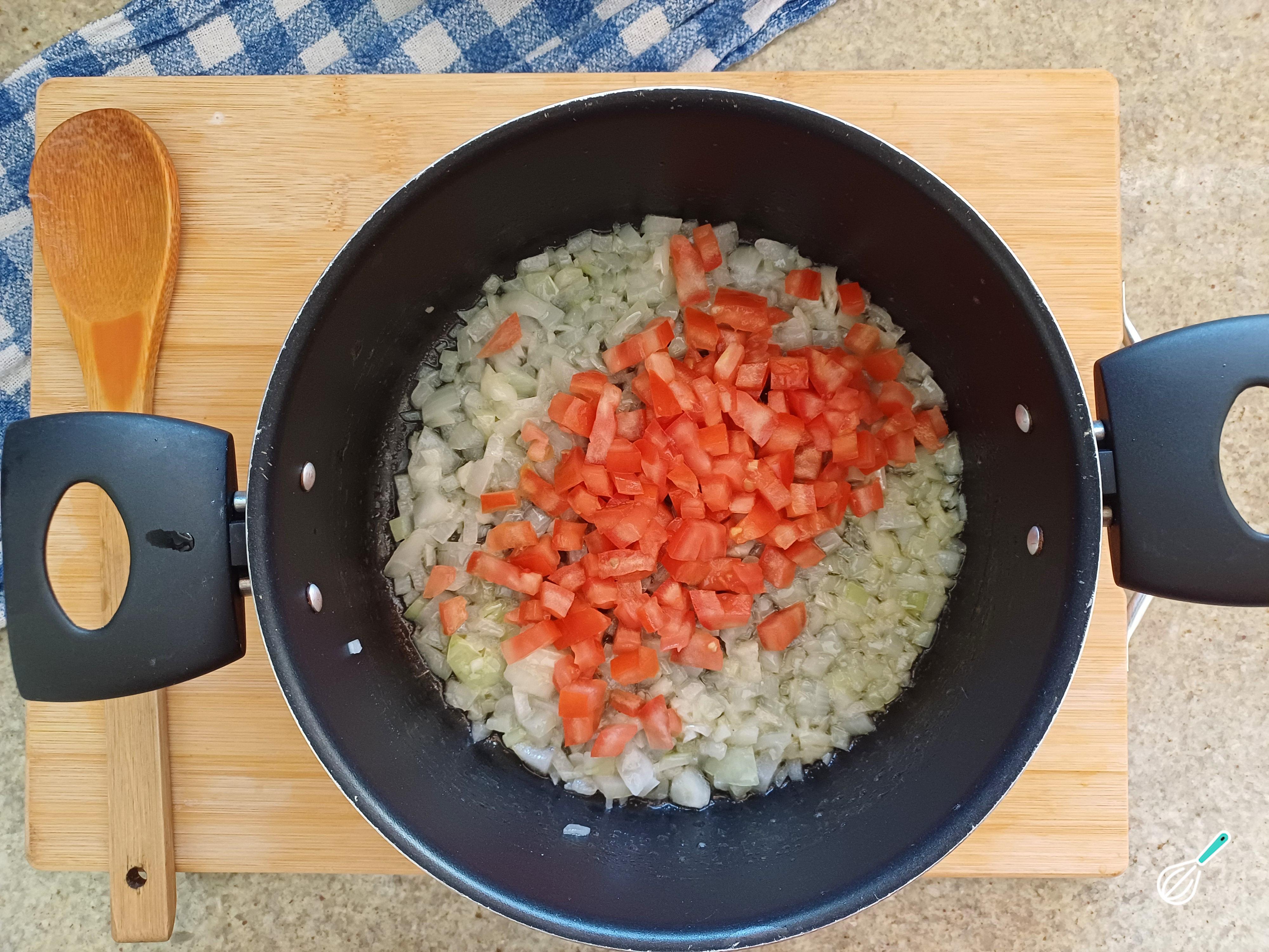 Coloque o tomate picado e deixe cozinhar por alguns minutos até que o tomate esteja macio e comece a desmanchar.