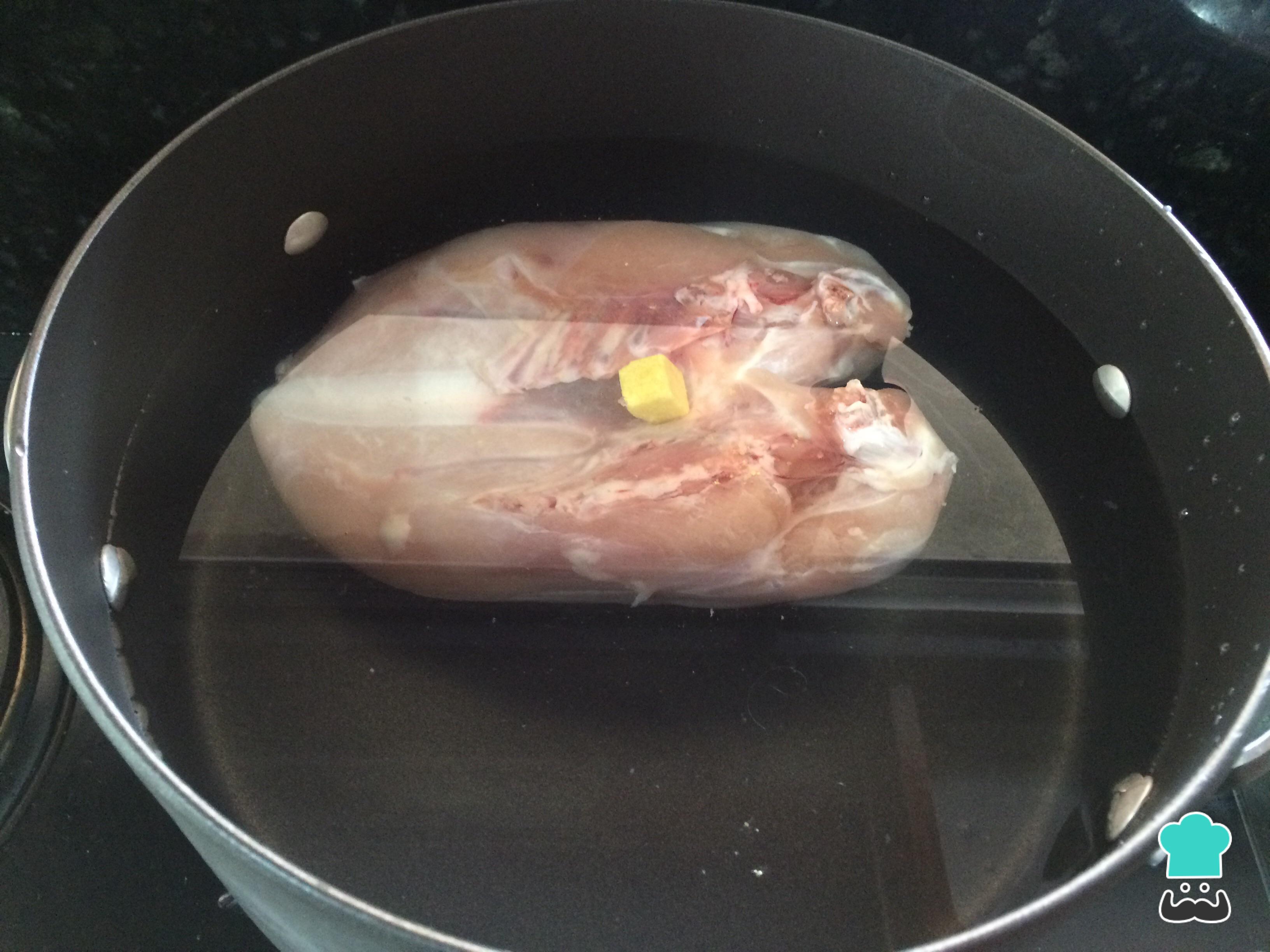 Em uma panela com água e o tablete de caldo, cozinhe o peito de frango em fogo médio por 40 minutos. Quando estiver pronto, retire, desfie e reserve o caldo.