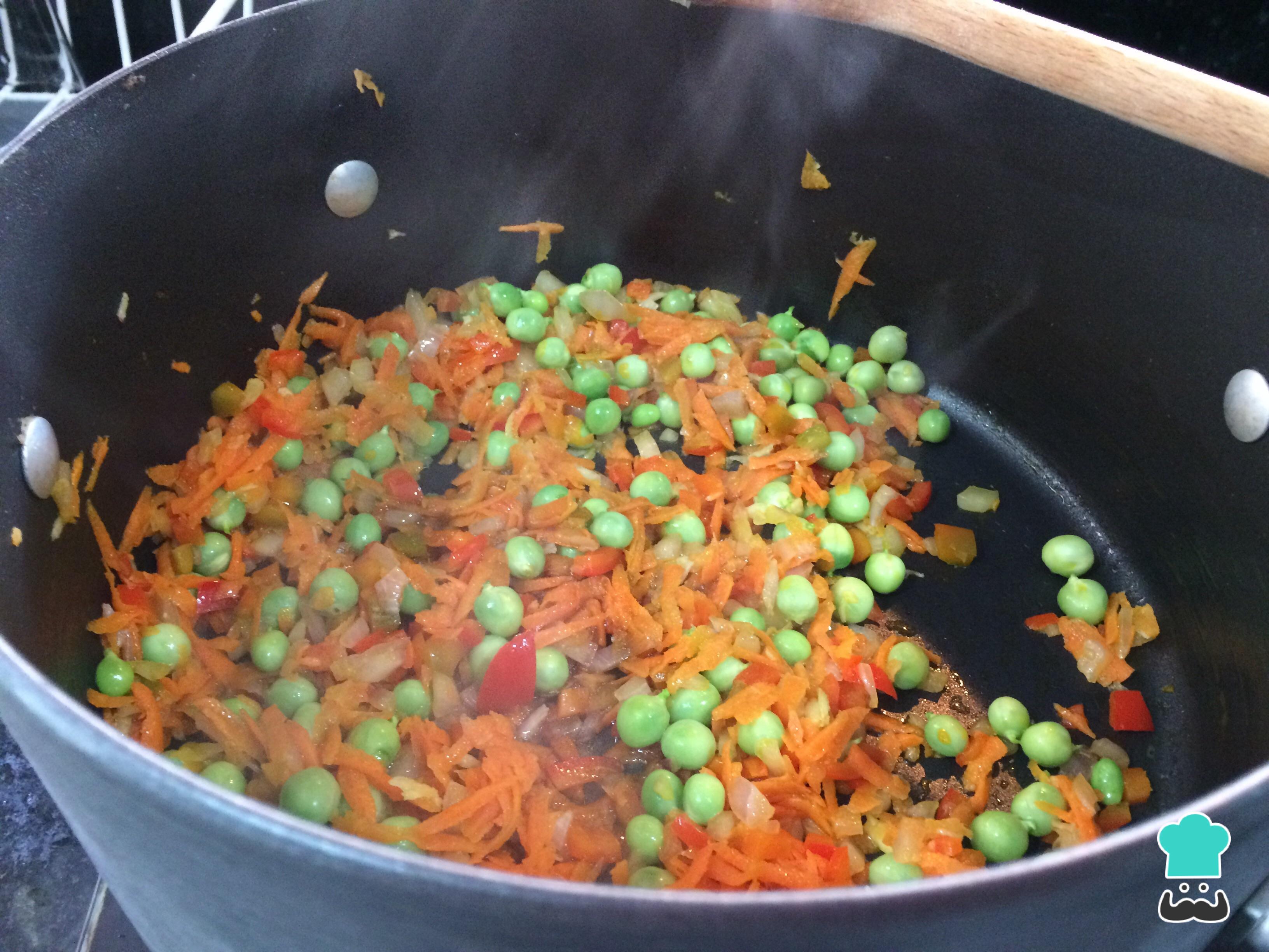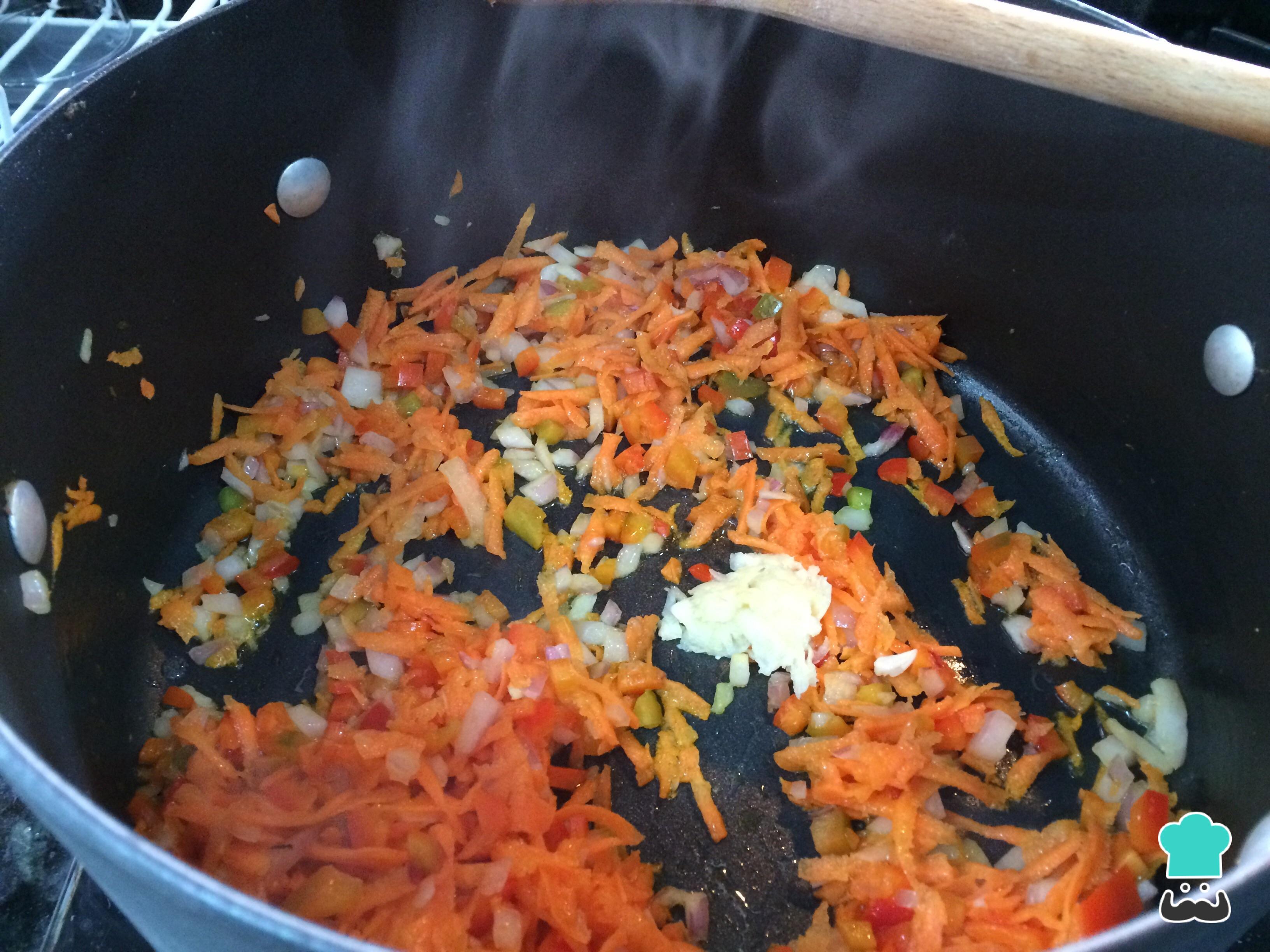 À parte, prepare um refogado em uma panela em fogo médio com um pouco de óleo: adicione a cebola, o pimentão, a cenoura e os alhos macerados. Deixe cozinhar, mexendo de vez em quando, até estes ingredientes amolecerem.