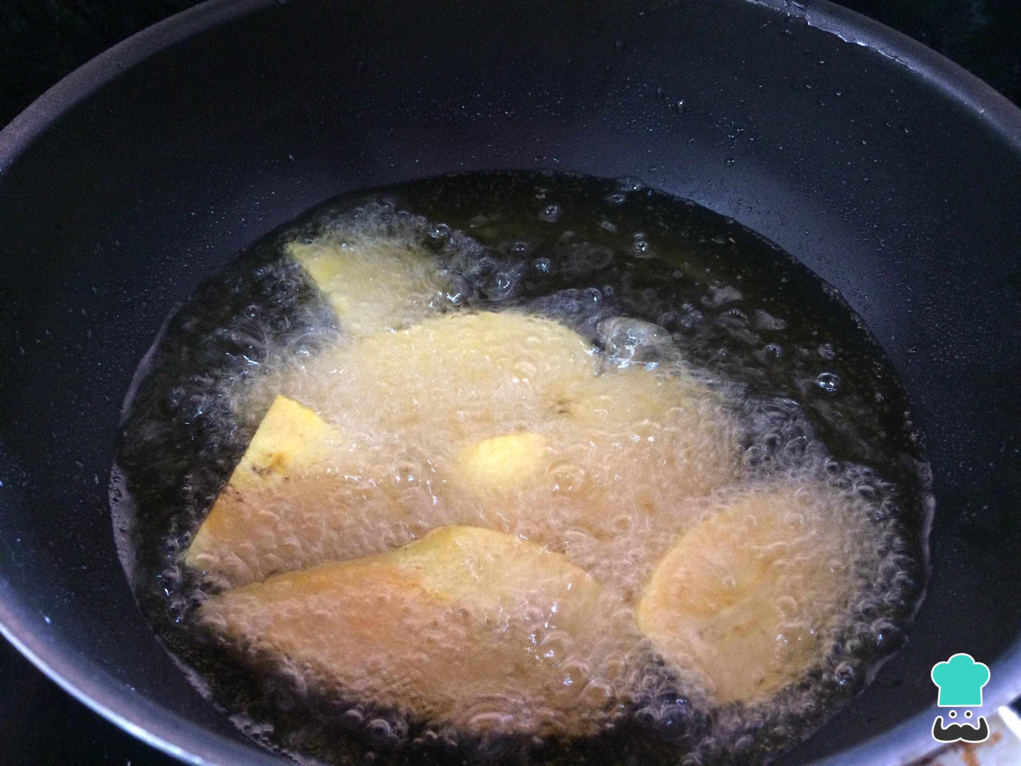 Enquanto isso, descasque a banana e corte em rodelas. Frite em óleo quente até que estejam douradas, e retire para um prato com papel absorvente.