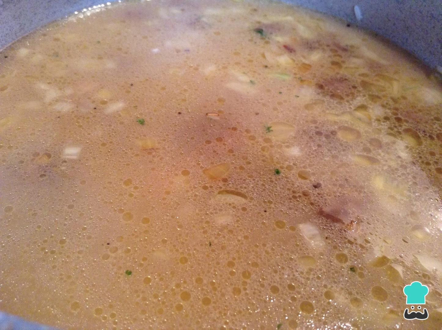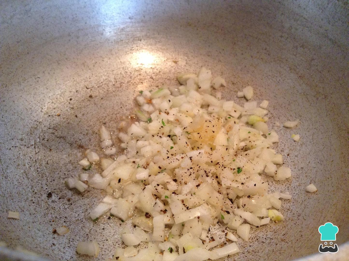 Em seguida leve uma panela ao fogo médio com o óleo e a cebola finamente picada. Enquanto a cebola refoga, junte o sal, a pimenta do reino e pasta de alho a gosto.