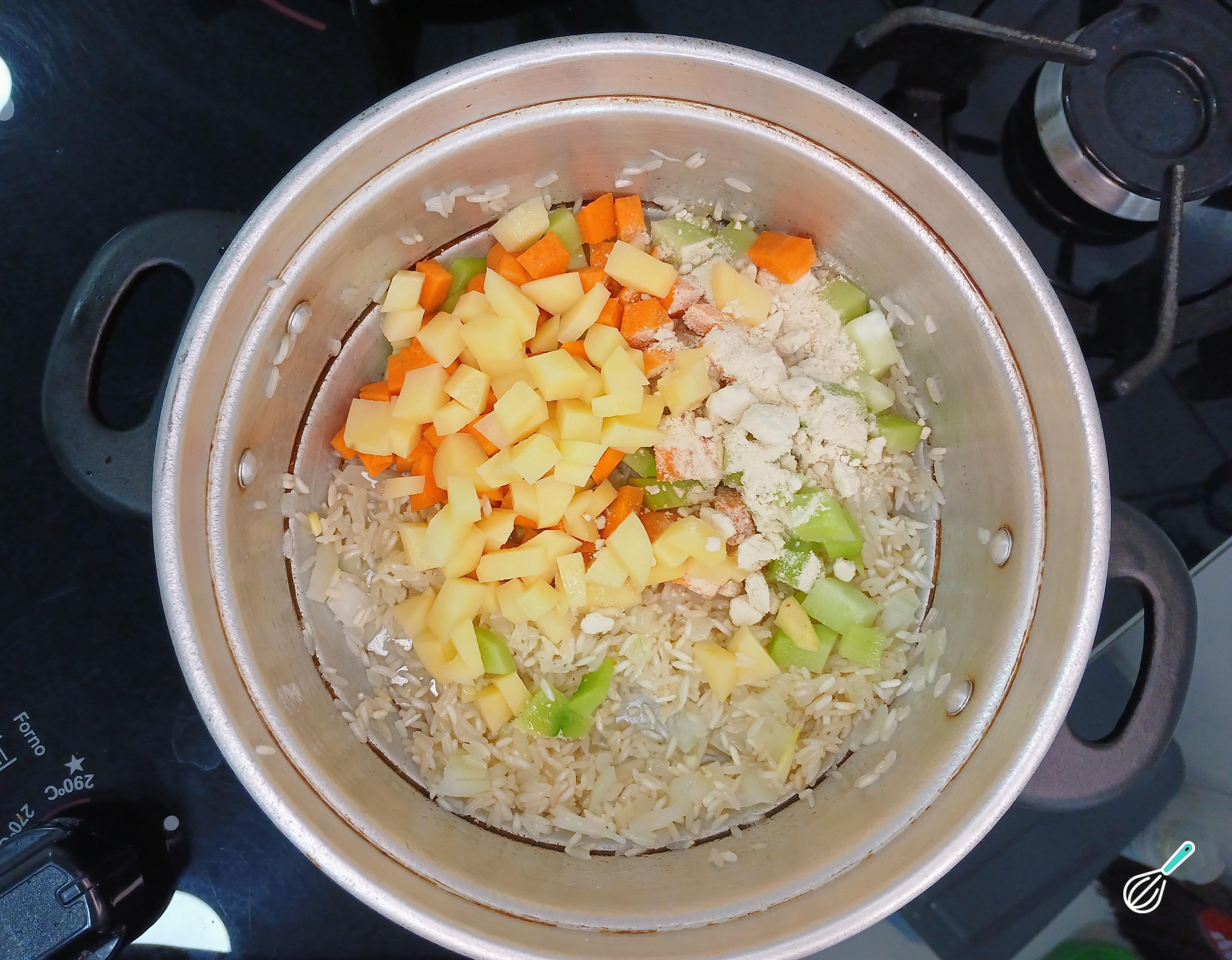 Quando o arroz já estiver refogado, adicione os legumes cortados e refogue junto. Adicione sal, alho e cebola em pó e pimenta moída. Mexa bem para incorporar os sabores. Os legumes poderão ser substituídos por outros de sua preferência.