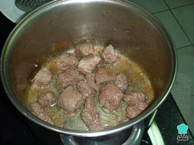 Para fazer arroz com legumes e carne, comece por aquecer o azeite em uma panela. Junte a carne, previamente cortada em cubinhos, e refogue até dourar. Descasque a cenoura, corte-a em pedaços pequenos e adicione à carne.