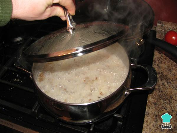 Adicione a água quente e tempere com sal e pimenta do reino a gosto. Junte a polpa de tomate e, assim que ferver, junte também o arroz e as ervilhas. Mexa tudo, tampe e deixe cozinhar por 15 minutos.