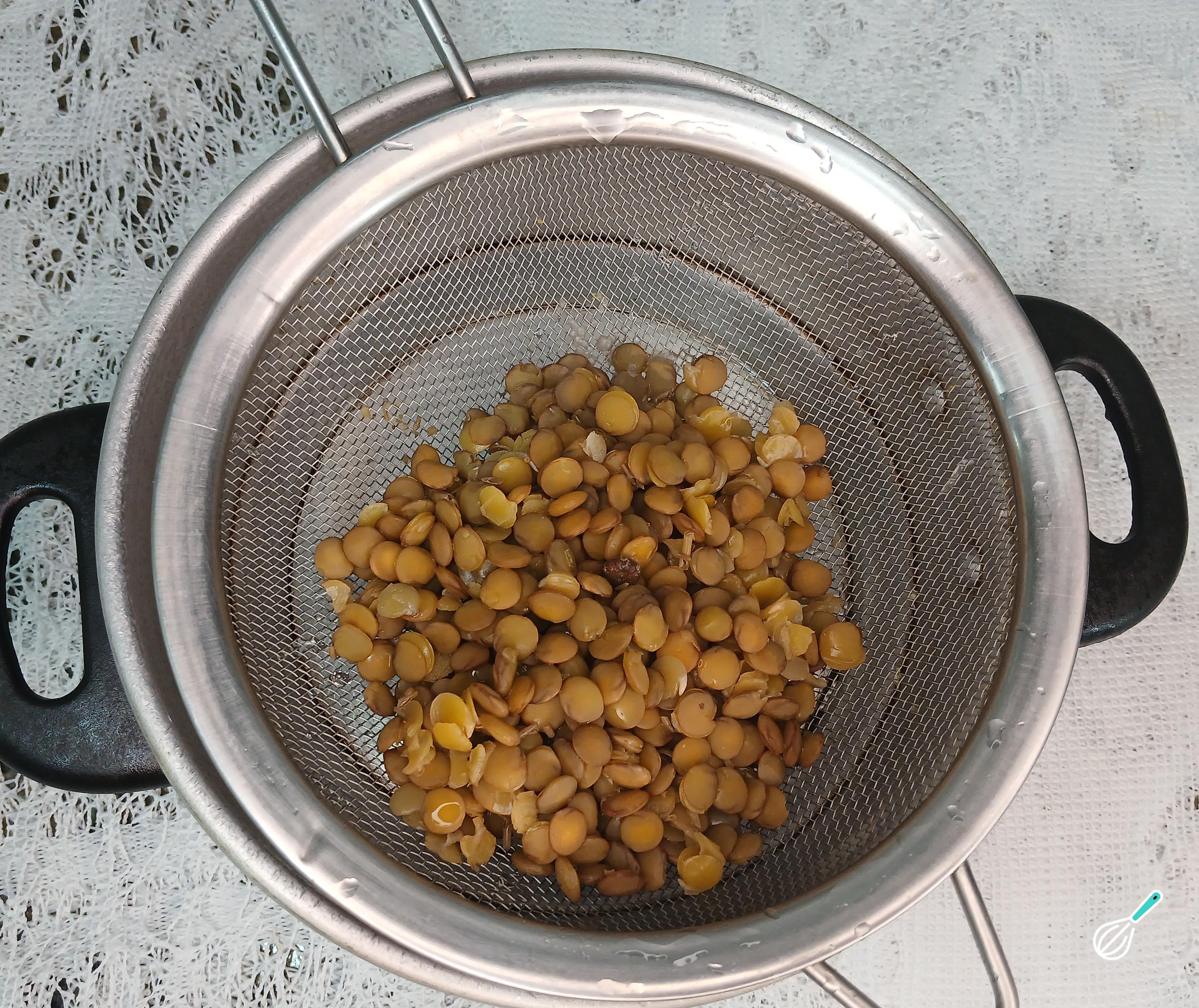 Assim que a lentilha estiver cozida, retire do fogo e deixe escorrer em uma peneira fina. Reserve.