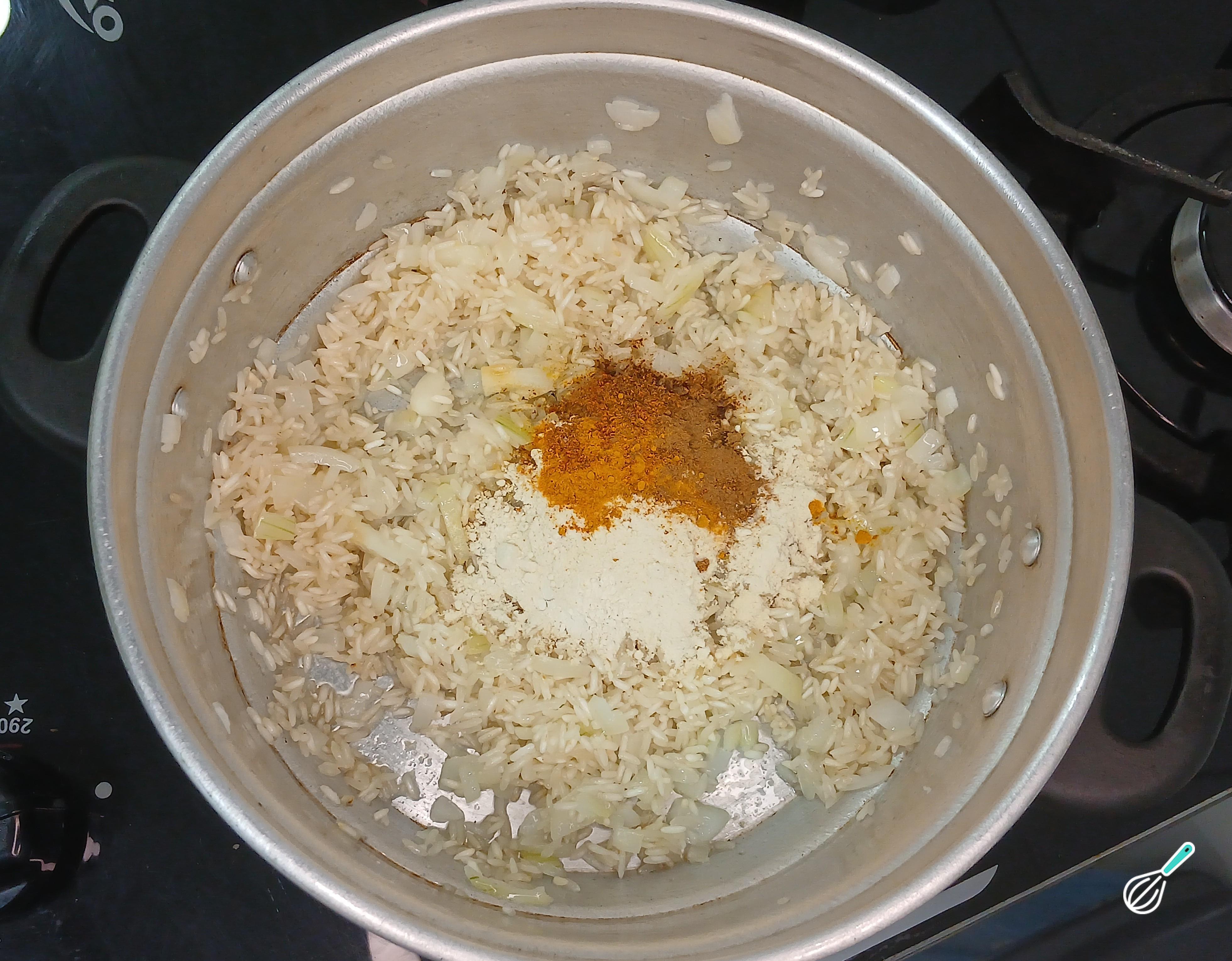 Quando o arroz já estiver refogado, adicione os temperos. Coloque-os todos juntos e misture bem para absorver bem o sabor. Cubra o arroz com água e tampe a panela para que o arroz cozinhe, mantenha o fogo baixo.