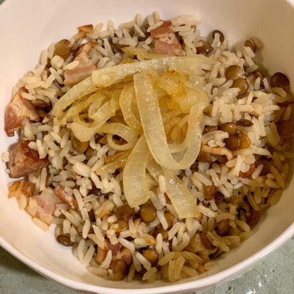 E estará pronto o arroz com lentilha e cebola! Um prato muito saboroso e típico de se preparar como acompanhamento para a ceia de ano novo no Brasil. Experimente e bom apetite!