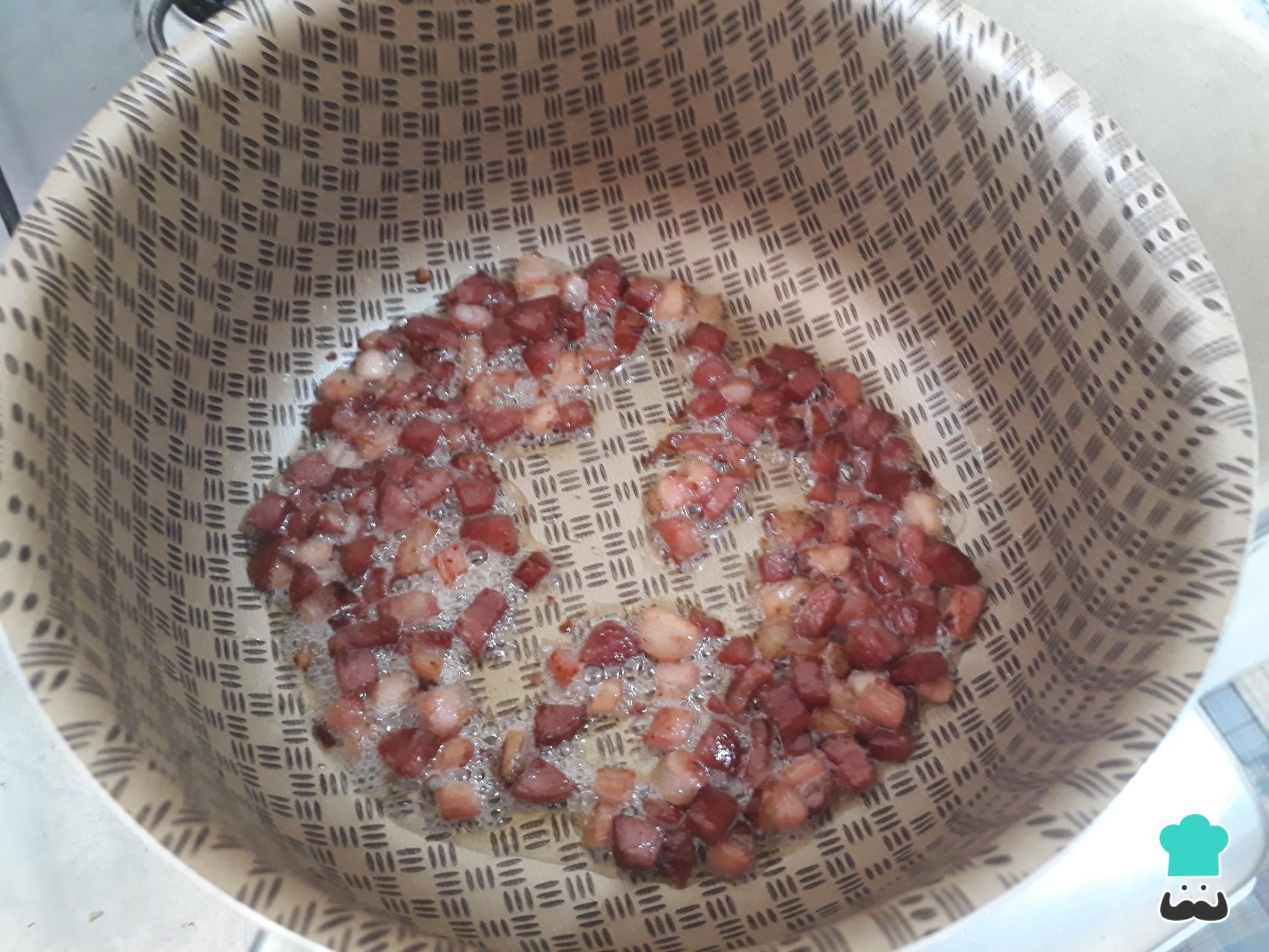 Agora na mesma panela do cozimento coloque o azeite, o bacon e a calabresa. Frite bem até ficar douradinho, depois acrescente a cebola e o alho triturados.