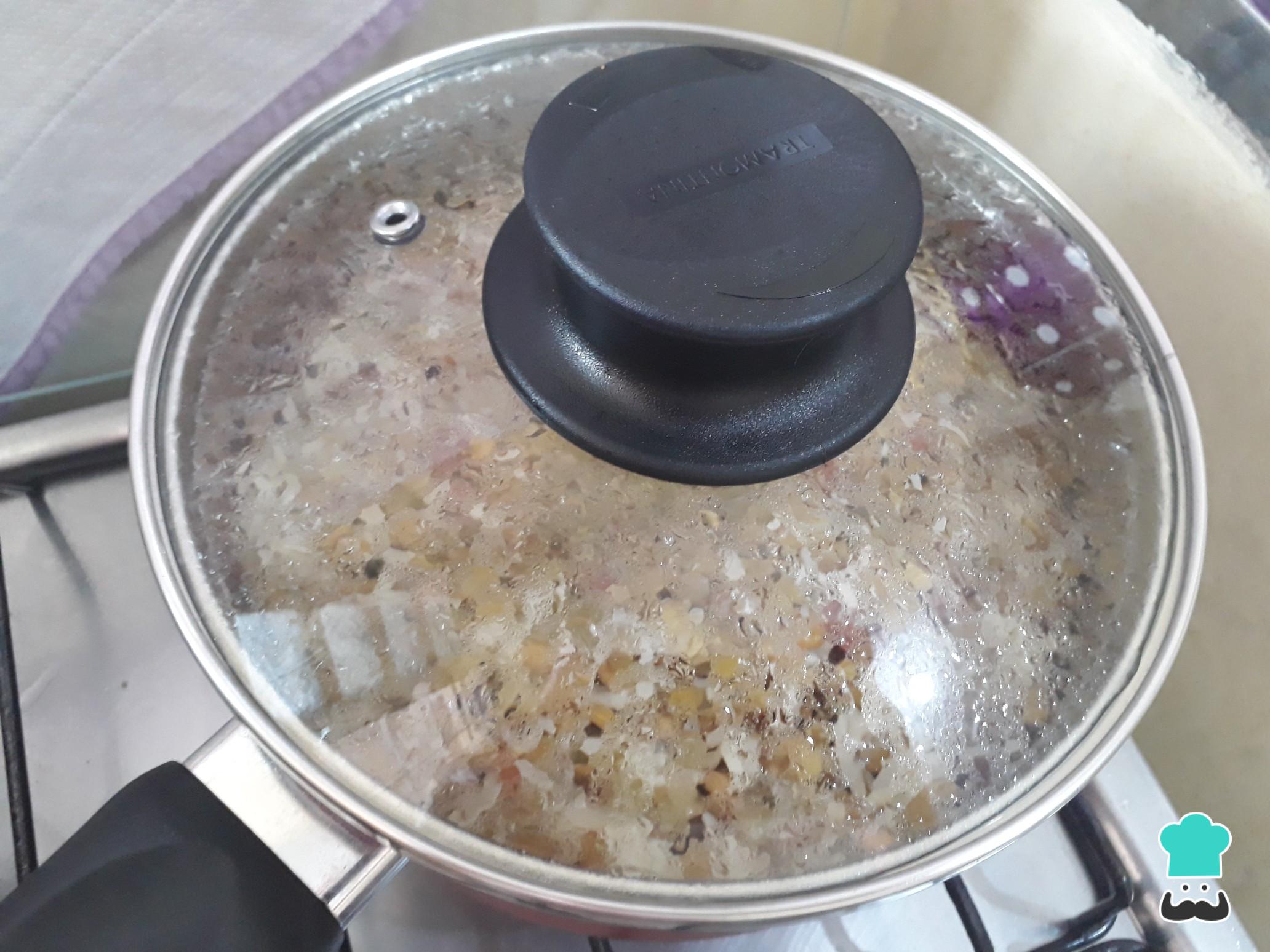 Acrescente o arroz cru e as lentilhas pré cozidas e escorridas e refogue por 3 minutos.