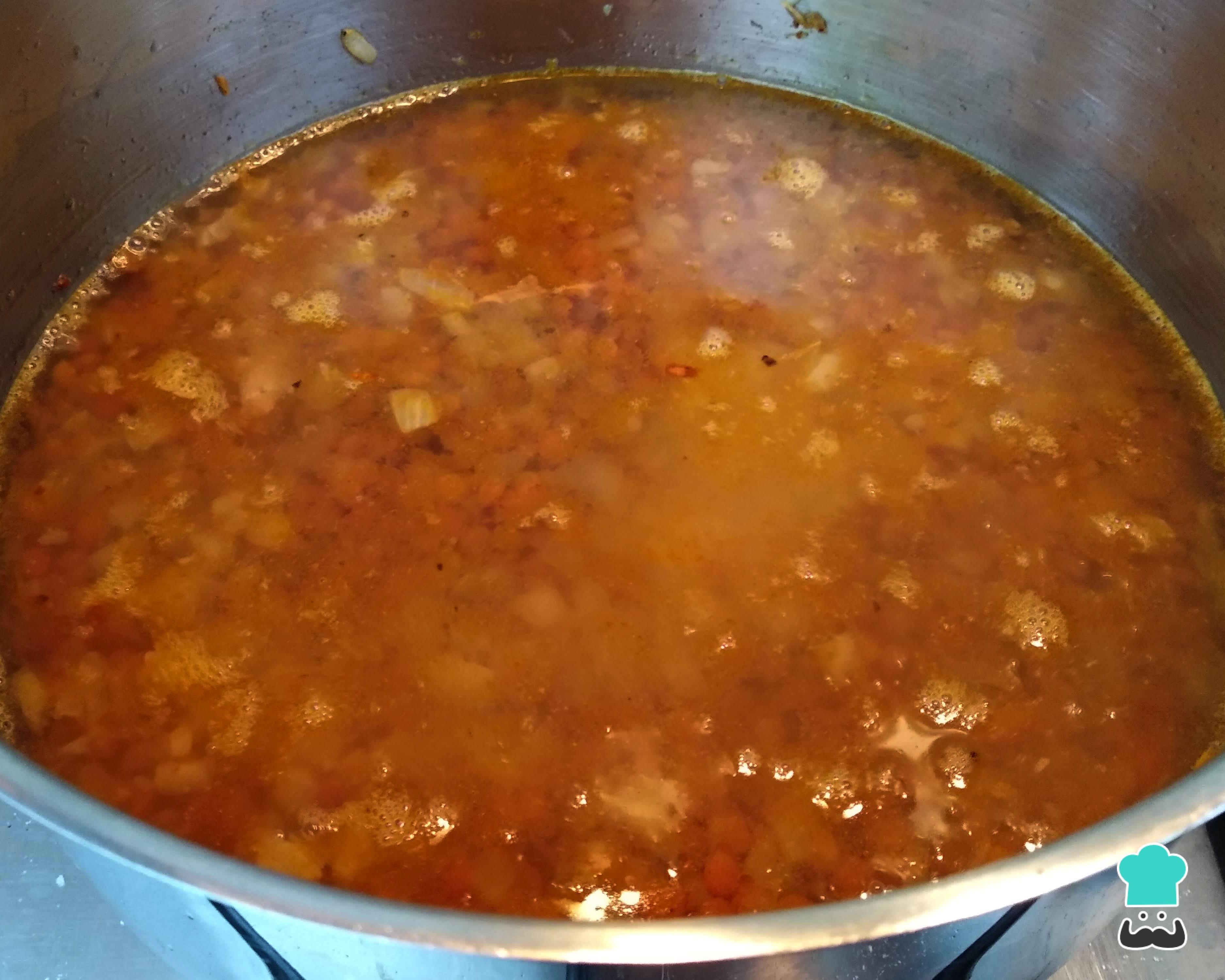 Depois coloque as lentilhas e 1 xícara de água, caldo de legumes ou caldo de galinha. Tampe e deixe cozinhar por 10 minutos no fogo médio.