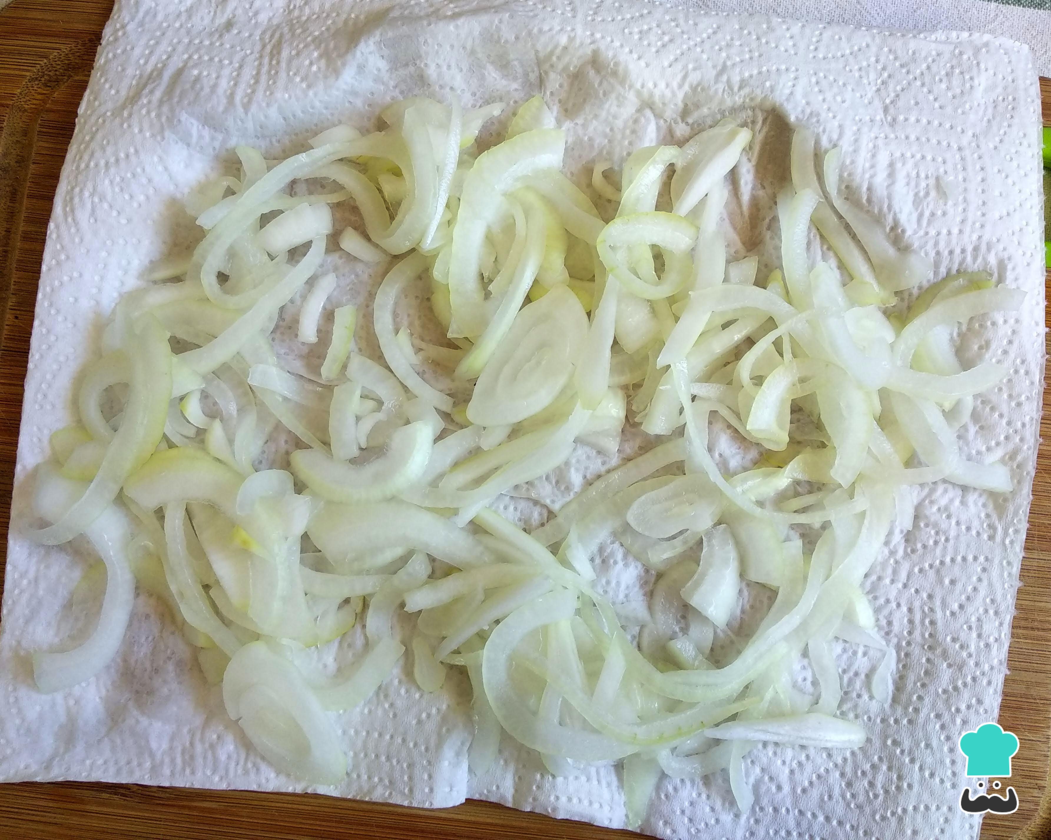 De volta à cebola, retire-a do escorredor e espalhe sobre 2-3 folhas de papel absorvente, como na foto. Cubra com mais 2-3 folhas e pressione, para que a cebola fique sequinha.