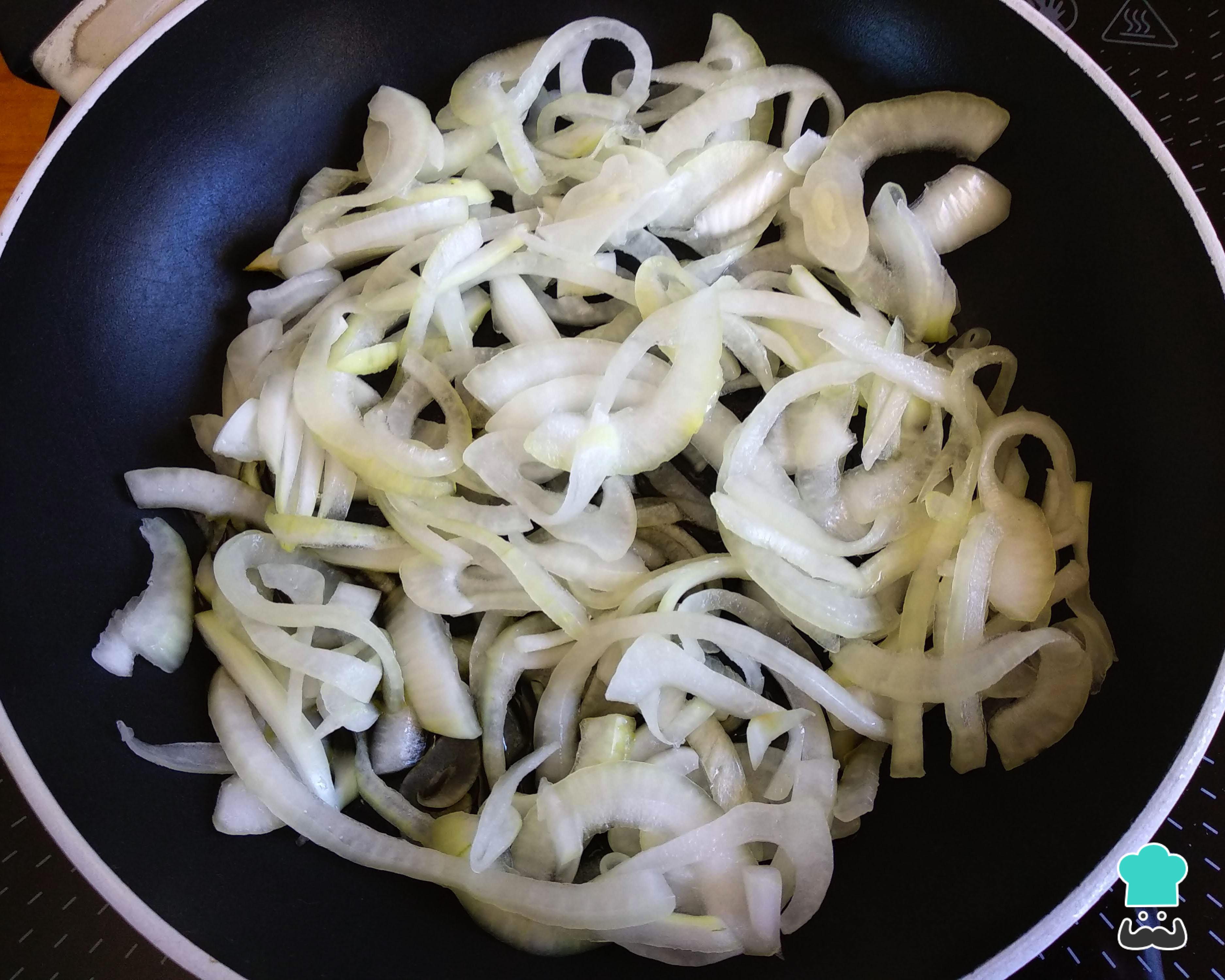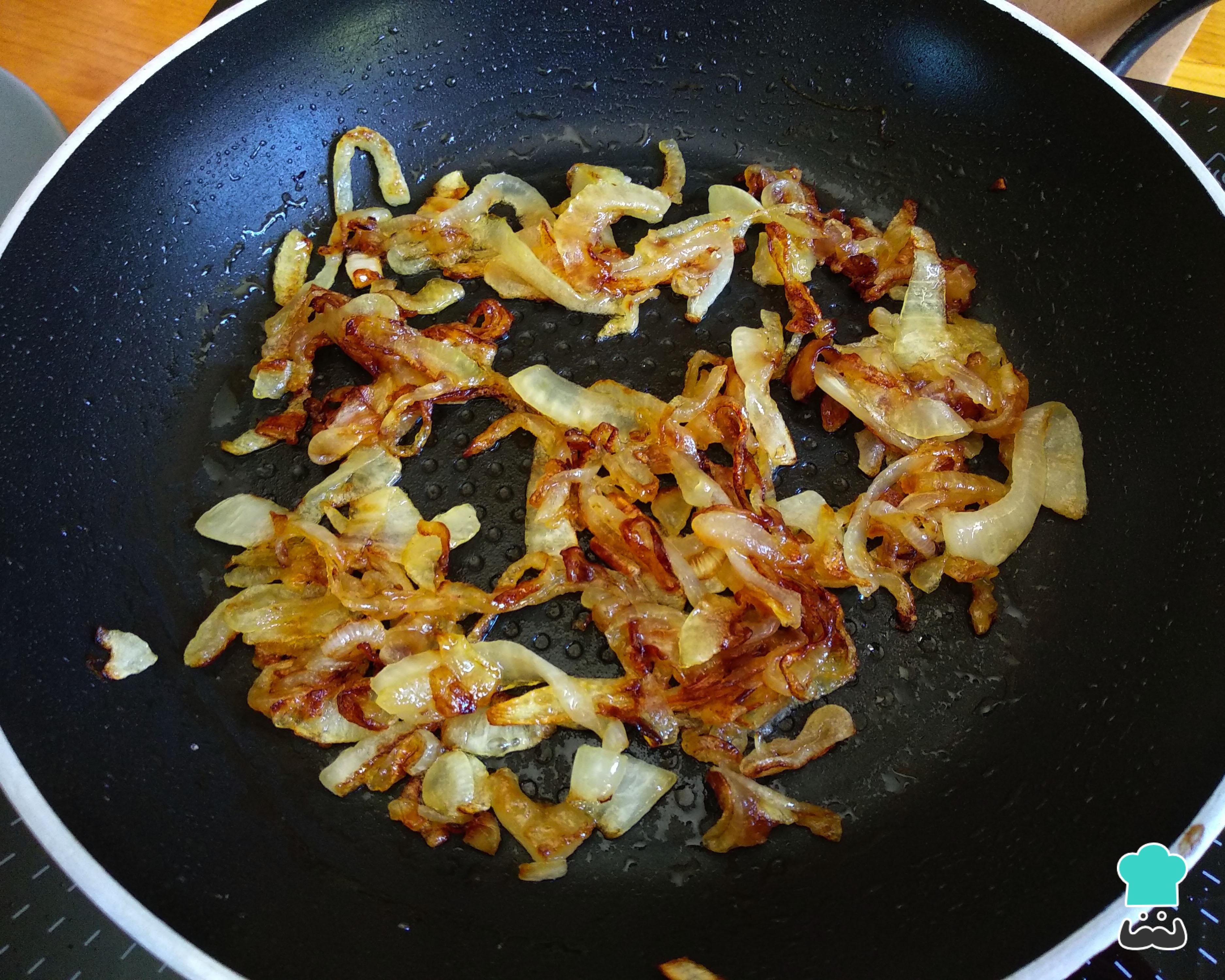 Leve ao fogo médio uma frigideira com as outras 2 colheres de sopa de azeite e coloque aí a cebola. Deixe refogar por 5 minutos ou até ficar macia.