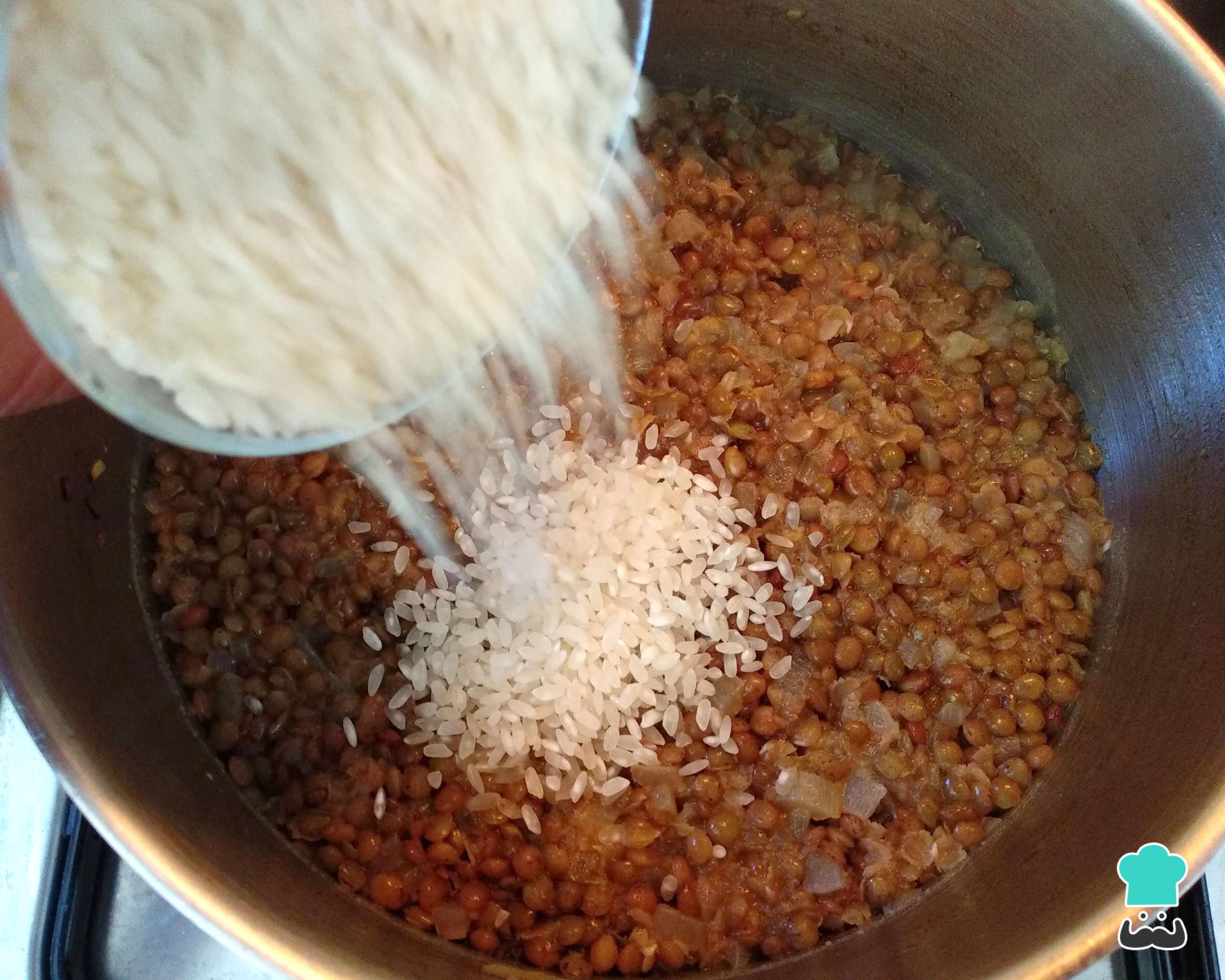Enquanto a cebola está amaciando, adicione o arroz na panela das lentilhas e coloque também mais 1 xícara de água ou caldo. Tempere com 1 colher de sopa rasa de sal, baixe o fogo, tampe e deixe cozinhar por 15 minutos.