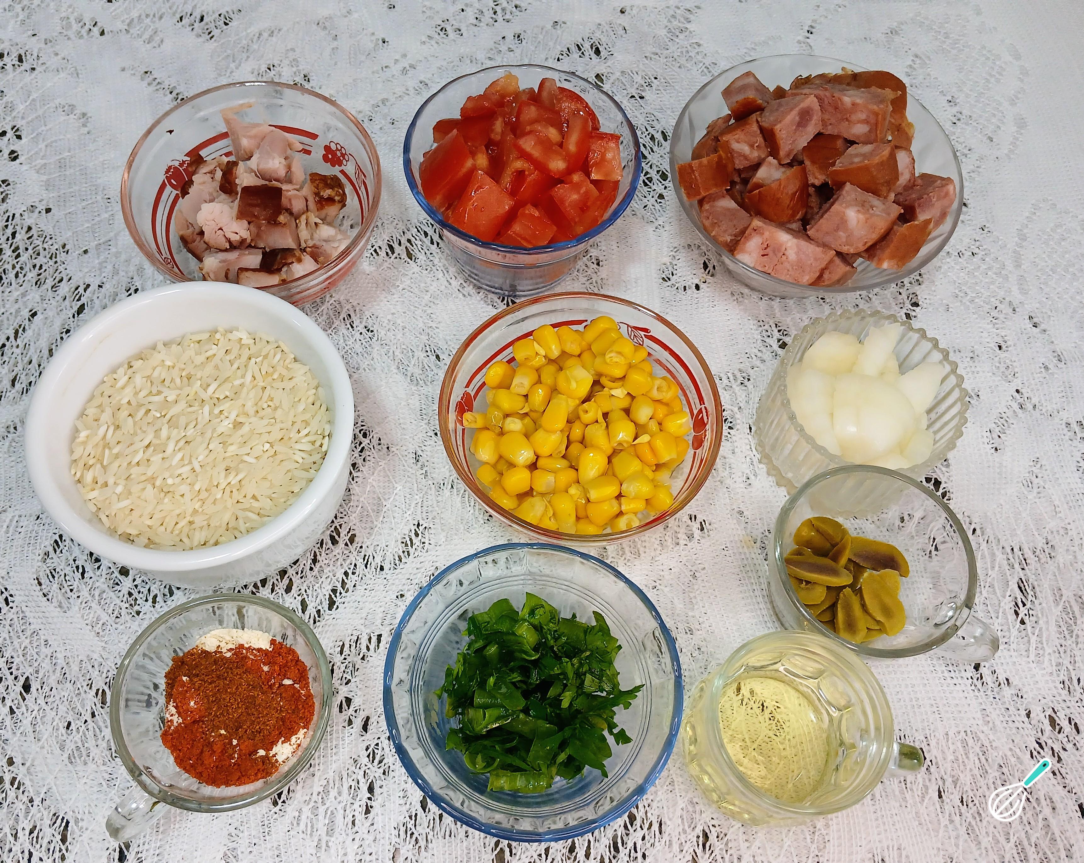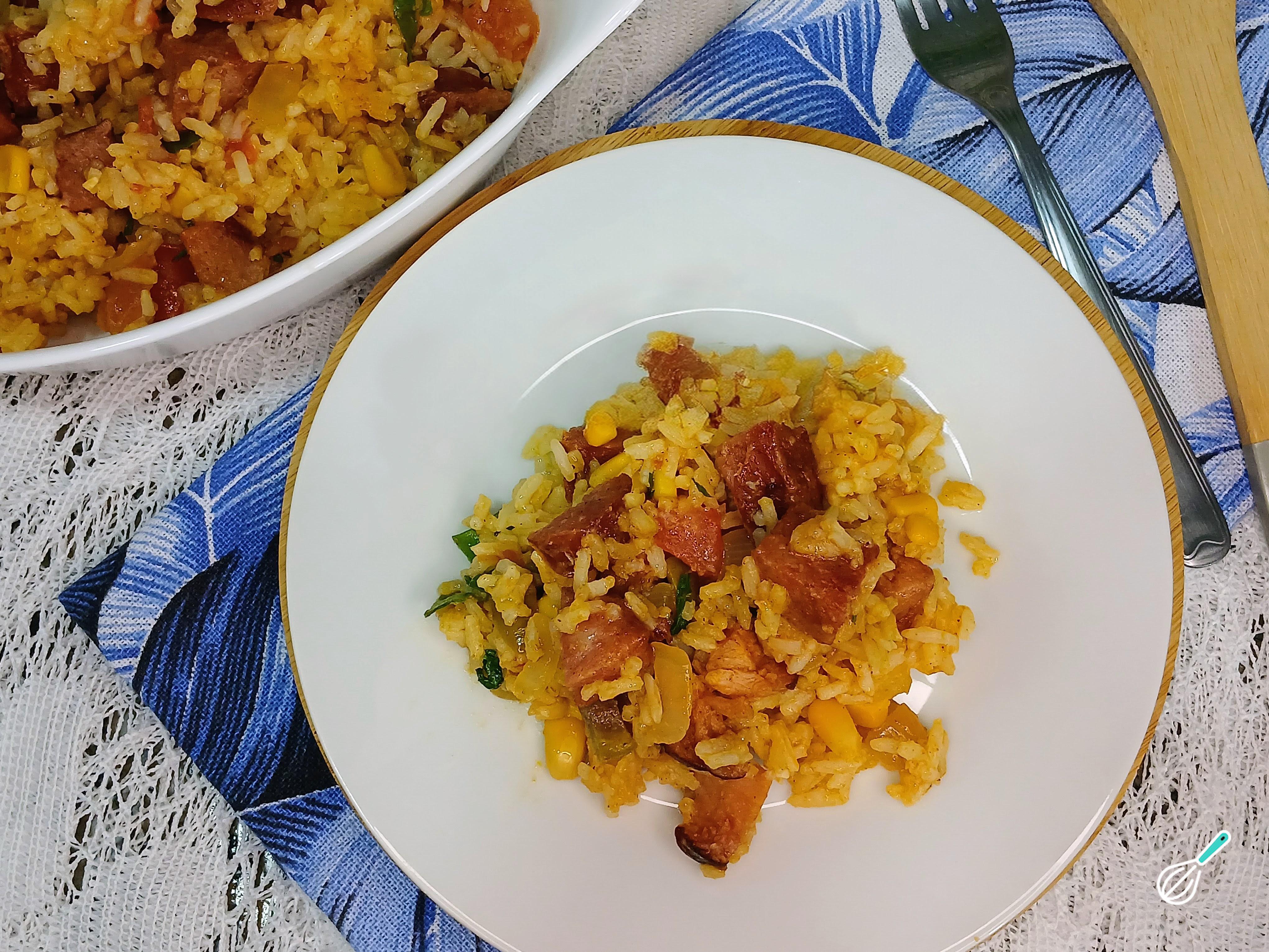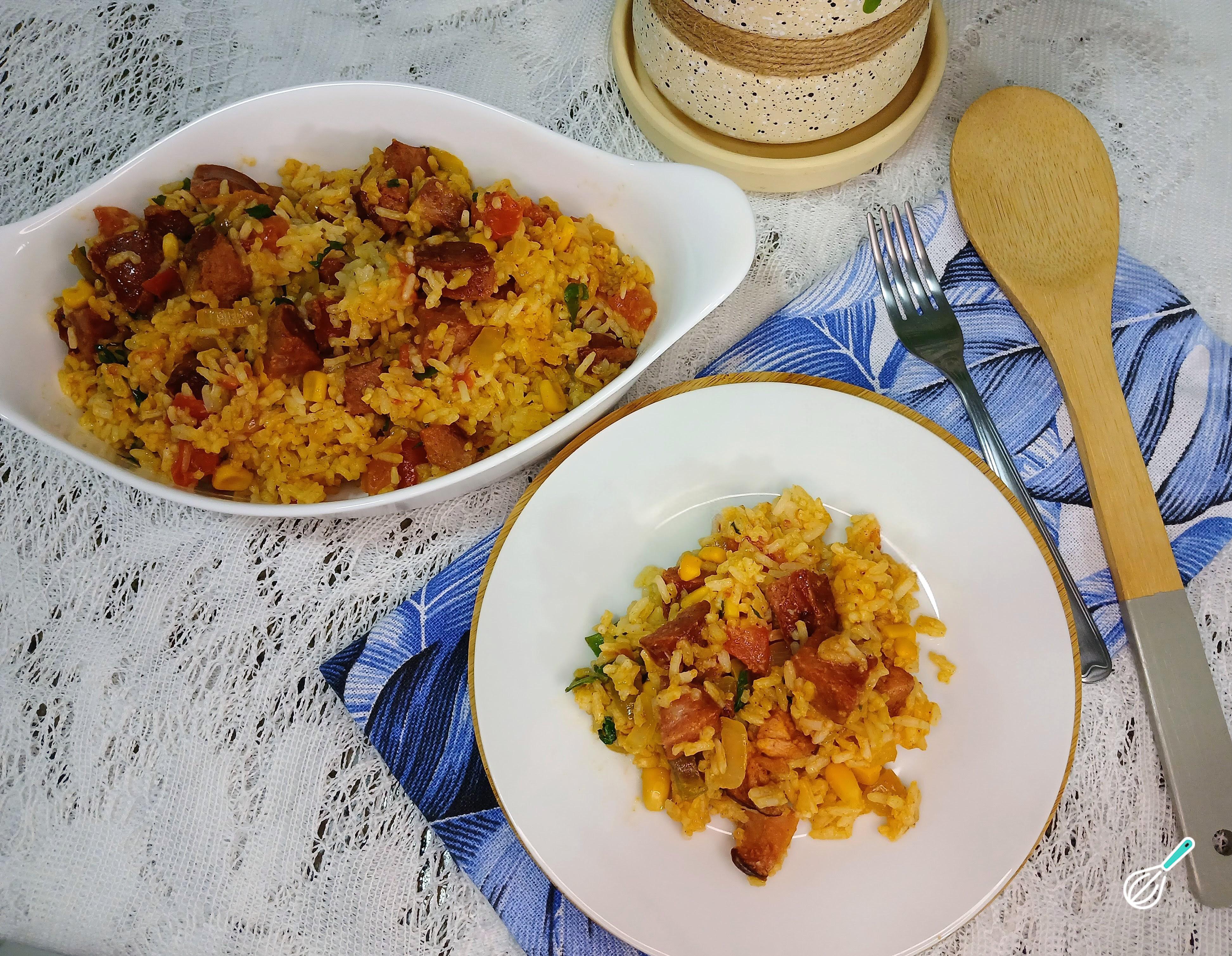 Vamos dar uma repaginada no nosso arroz do dia a dia? Preparar um belo arroz colorido e muito saboroso, um arroz com linguiça calabresa que também leva bacon, milho verde, azeitonas e tomate. Esse arroz é aquele tipo de refeição completa que dispensa acompanhamentos e serve muito bem em qualquer ocasião, podendo ser servido em almoços ou jantares simples a almoços e jantares festivos.