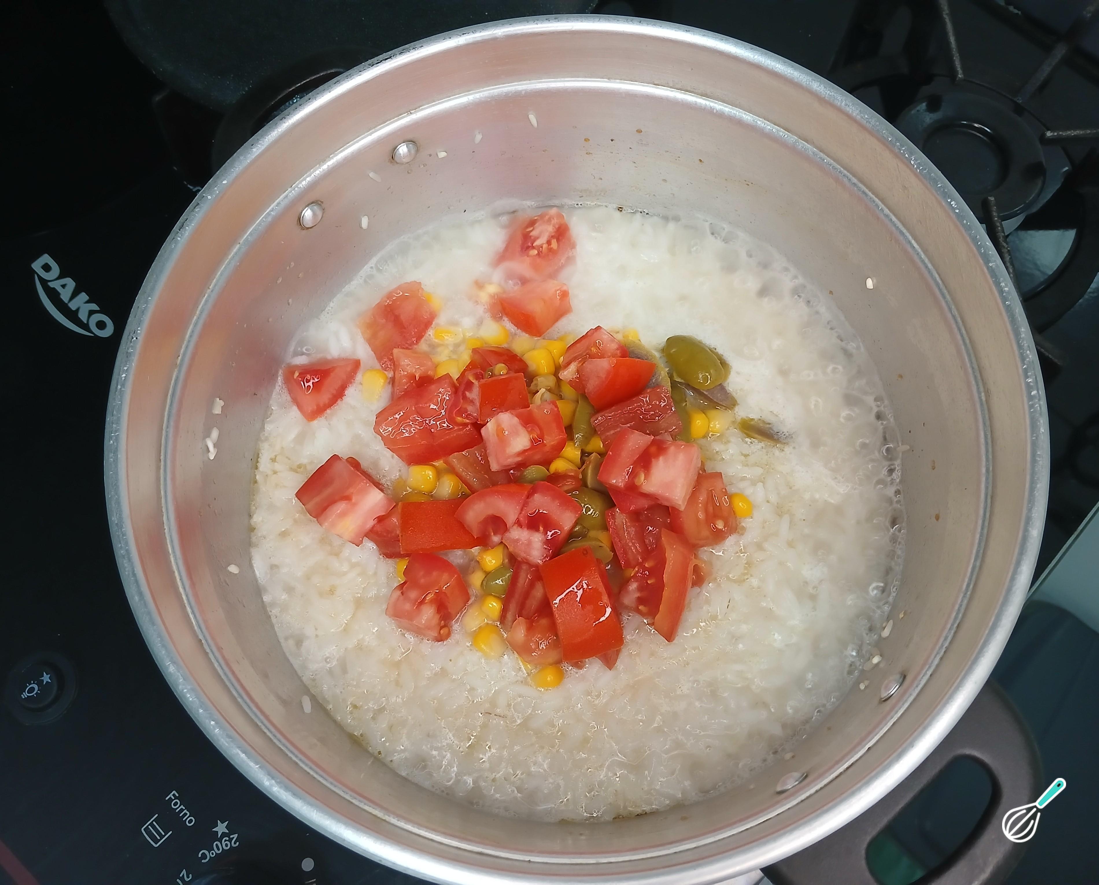 Enquanto isso, verifique se o arroz está secando e veja se esta cozido. Se ainda não, adicione mais água e acrescente o tomate, as azeitonas e o milho. Tampe a panela e deixe cozinhar sempre com o fogo baixo.