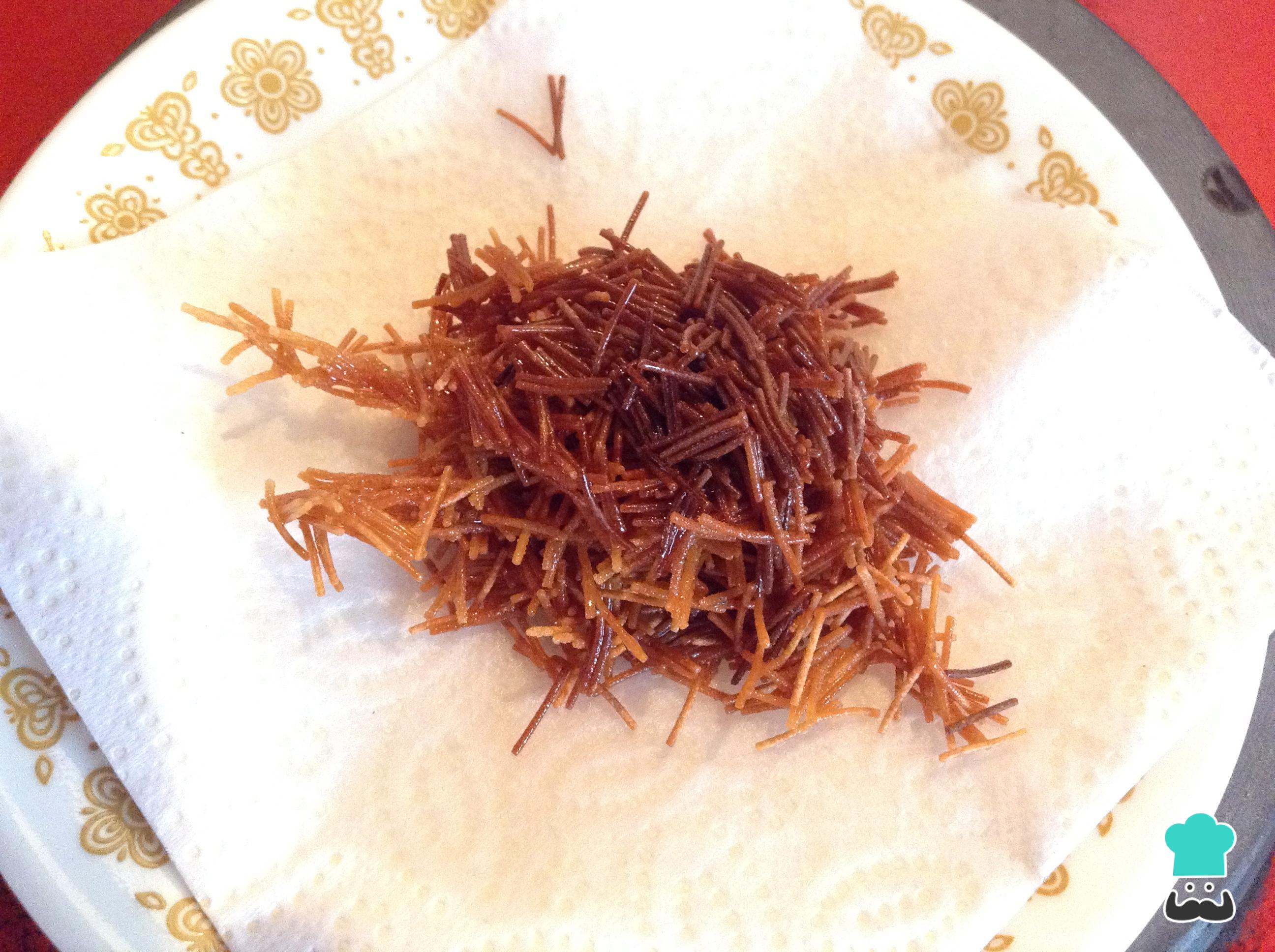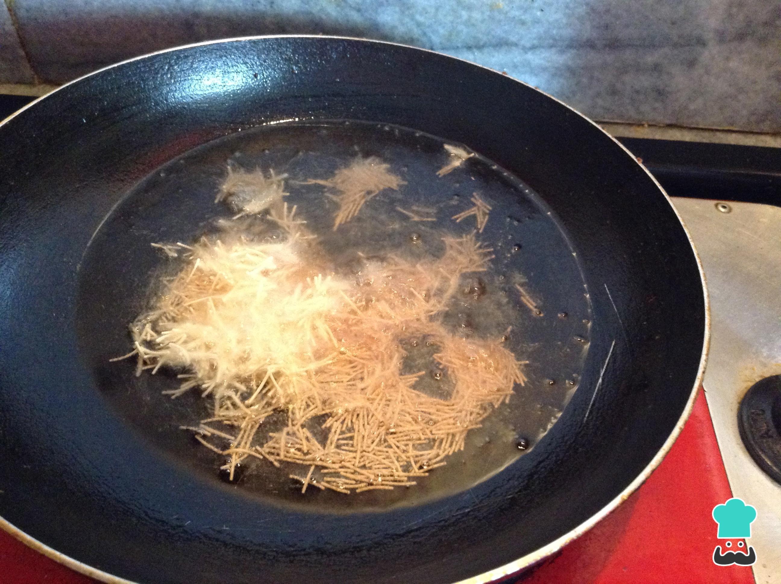 Assim que o óleo estiver quente, adicione o macarrão e cozinhe até que estejam dourado e crocante.