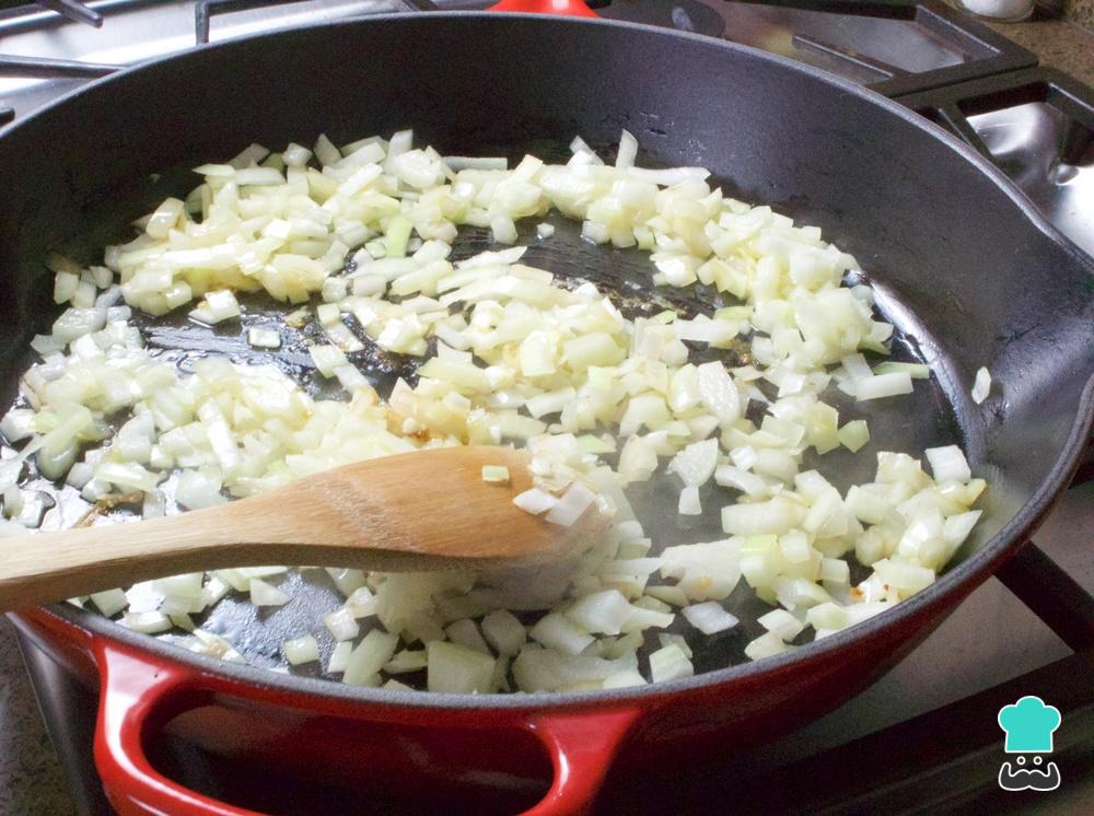 Para fazer arroz com mortadela, comece por derreter a manteiga em uma panela. Junte a cebola e o alho e deixe refogar por cerca de 3 minutos.