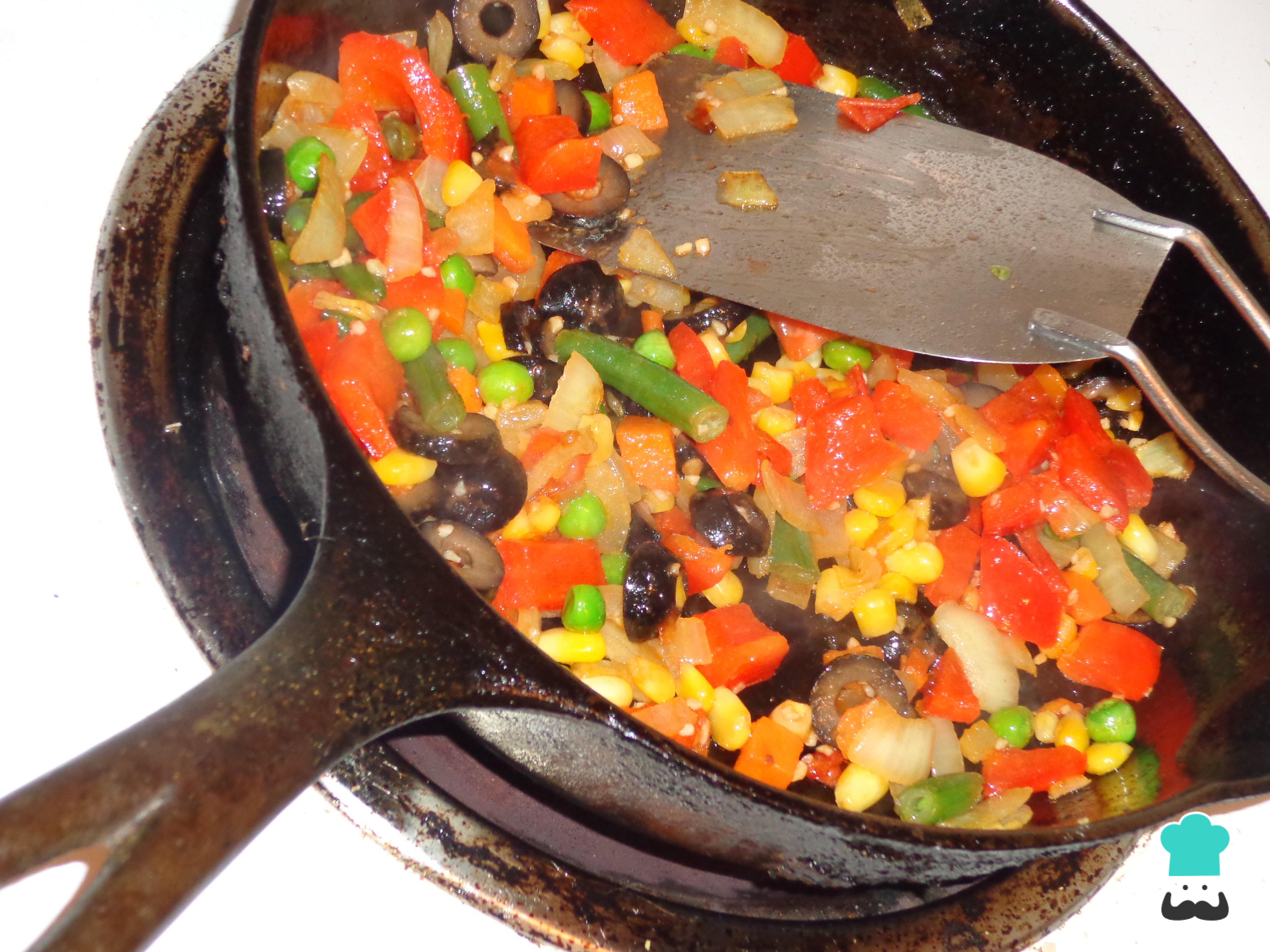 Depois disso, junte o tomate, a cenoura, a vagem e o milho. Deixe refogar por mais 2 minutos, junte a água e o tempero em pó e cozinhe por 4 minutos.