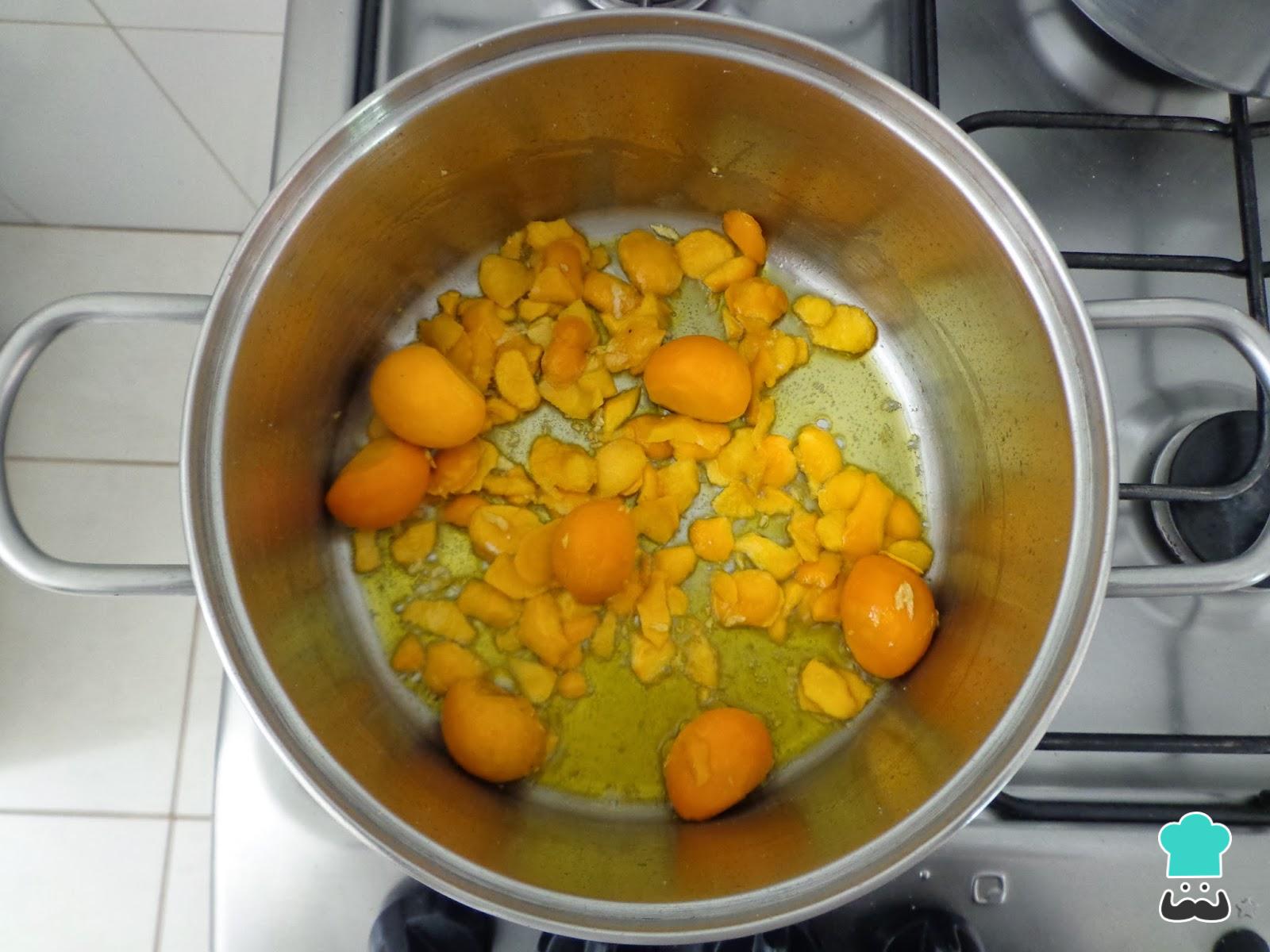 Para fazer esta receita de arroz com pequi simples, comece por fritar a cebola, o alho finamente picados e o pequi.