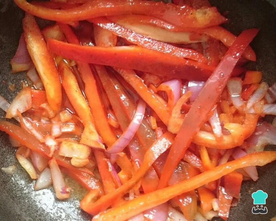 Corte a cebola em rodelas e o pimentão e a cenoura em tirinhas (corte juliana). Coloque esses legumes numa panela, adicione o azeite ou óleo e leve ao fogo médio. Deixe cozinhar por 3 minutos, mexendo de vez em quando, até os legumes ficarem macios.