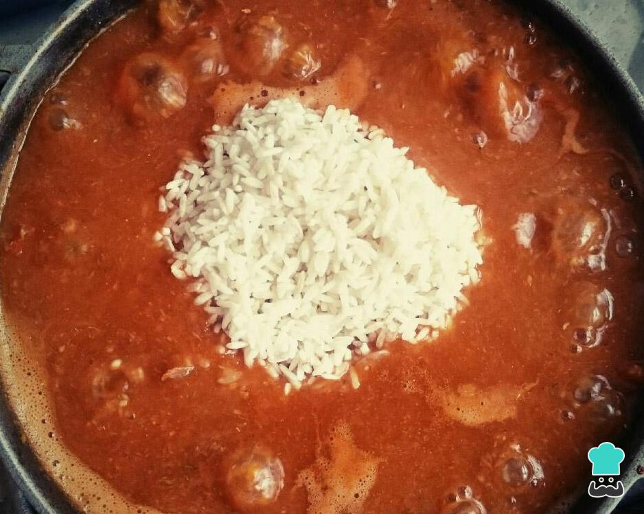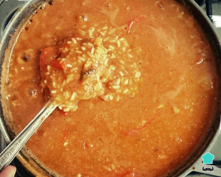 Em seguida, adicione a água na panela, o tablete de caldo, o molho de tomate, o colorau e o sal. Misture e espere ferver para adicionar o arroz também.