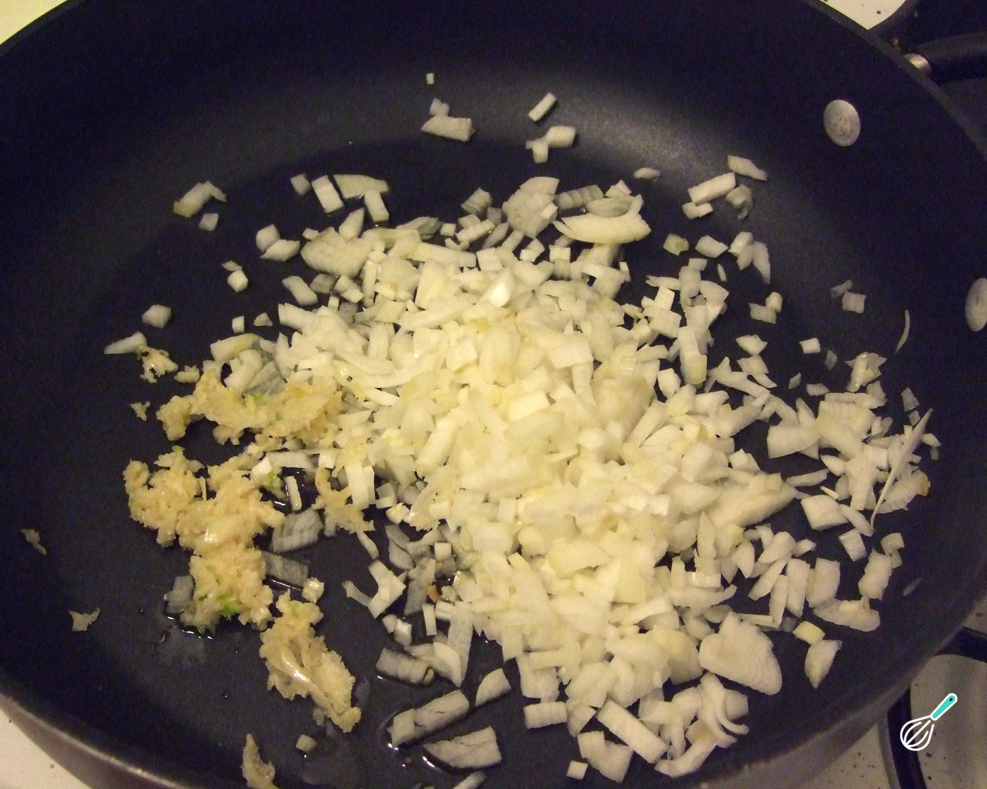 Leve ao fogo uma frigideira ou panela e refogue a cebola e o alho em um fio de azeite.