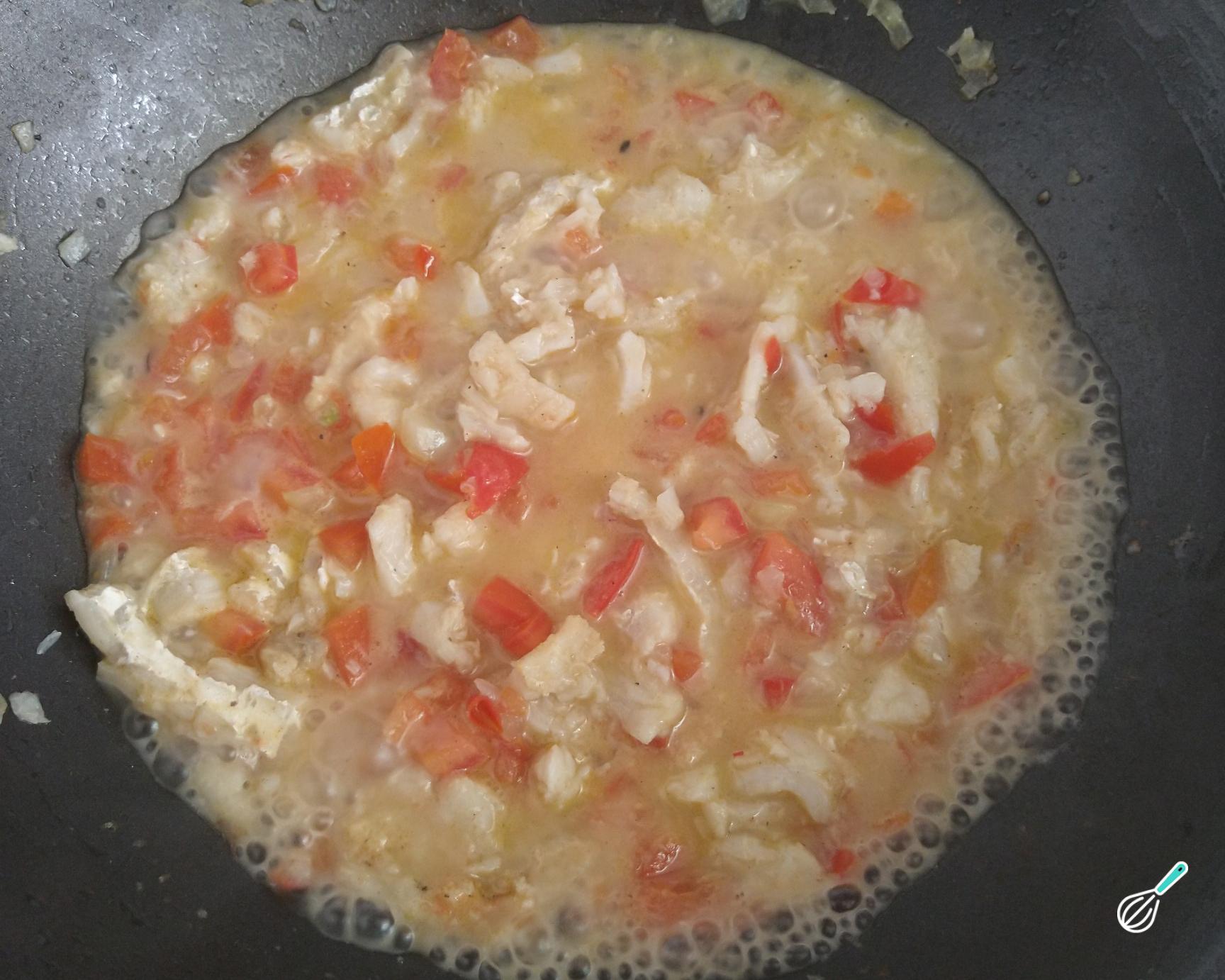Após refogar a cebola e o alho entre com o bacalhau já desfiado e os os tomates picados em cubinhos sem as sementes. Deixe cozinhar enquanto o bacalhau e os tomates soltam seus sucos, formando um caldo bem saboroso. Tempere com sal e pimenta do reino a gosto.