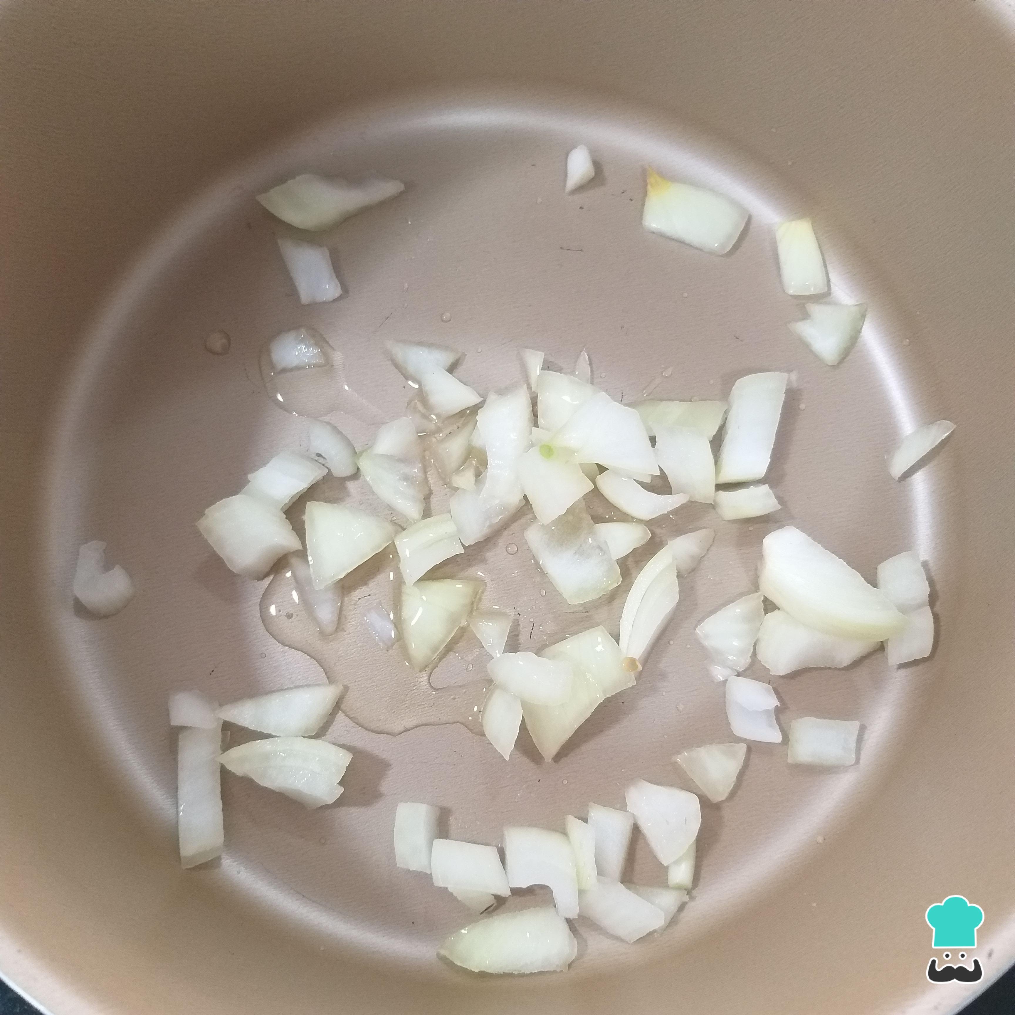 Para preparar esta receita de arroz de barranco de uma panela só leve uma panela alta ao fogo médio e acrescente o óleo e a cebola. Mexa até dourar.