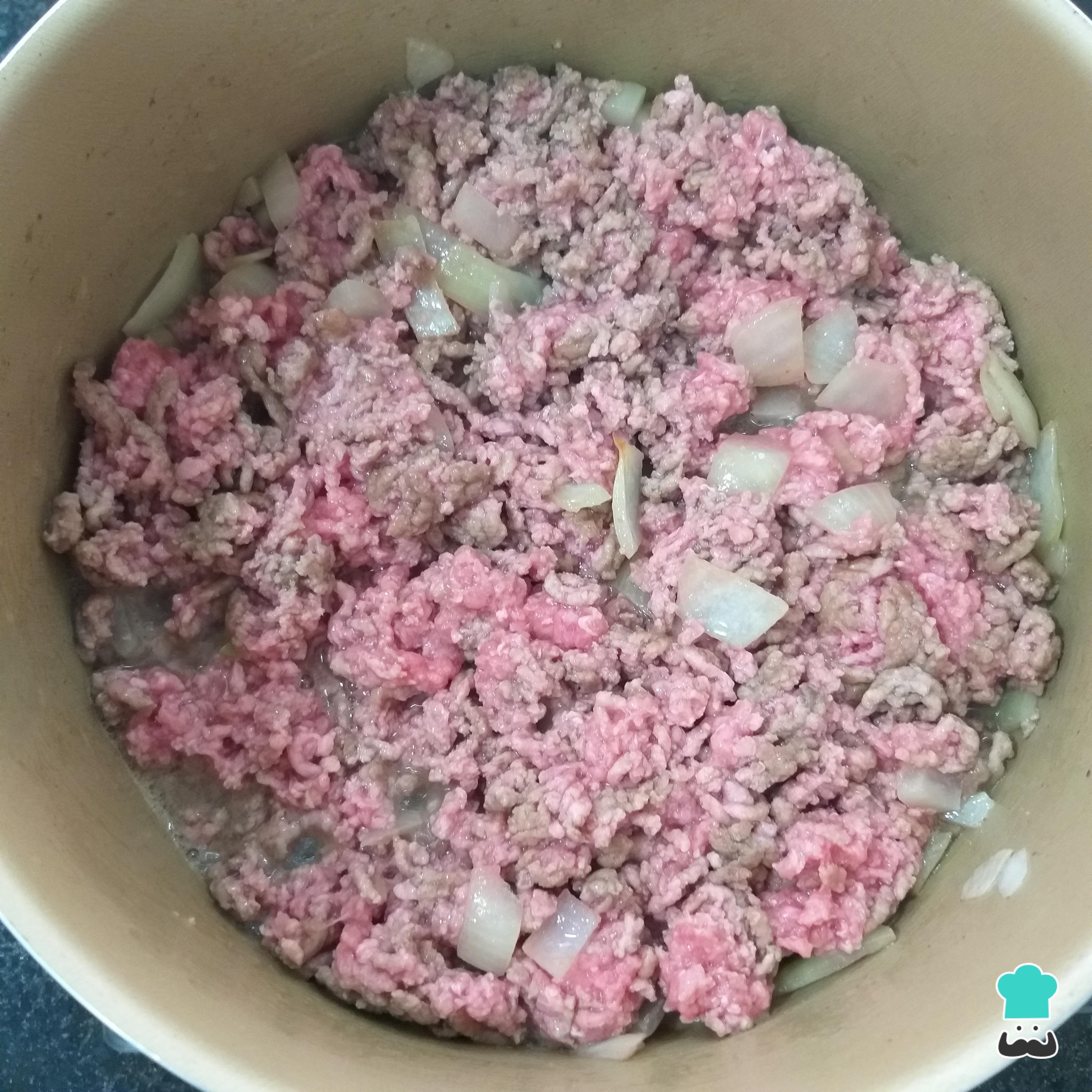 Em seguida coloque a carne moída e misture bem. Refogue por 2 minutos (a carne não precisa cozinhar completamente antes do passo seguinte, pois ela terminará de cozinhar junto com os demais ingredientes).