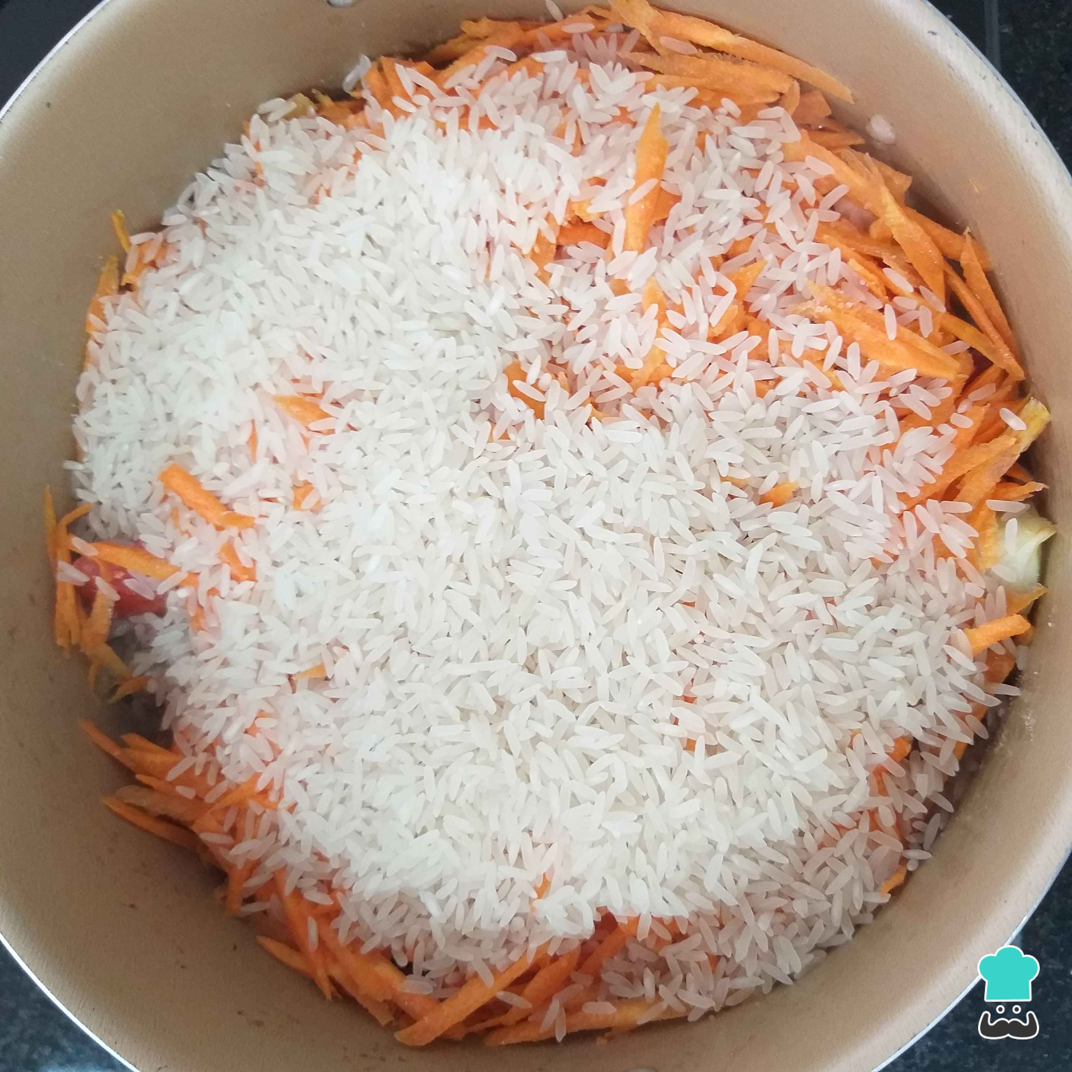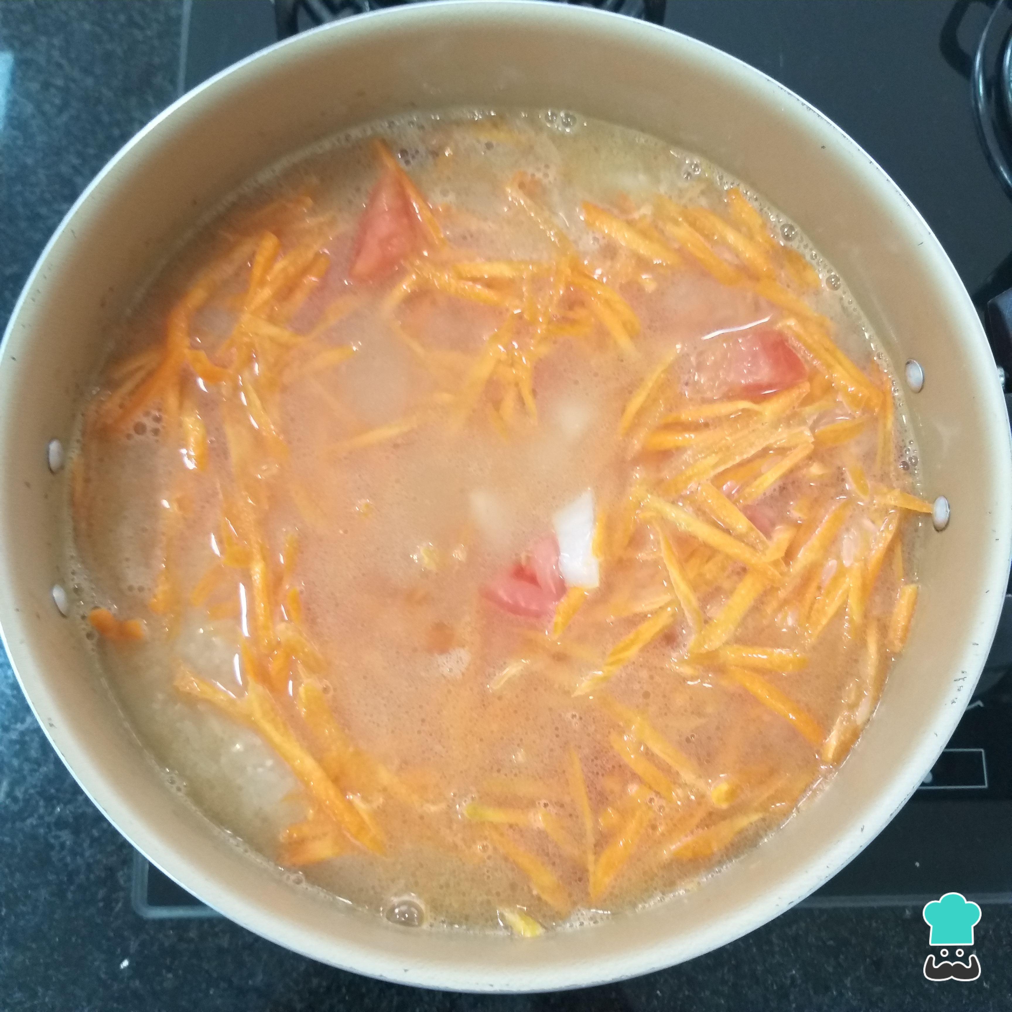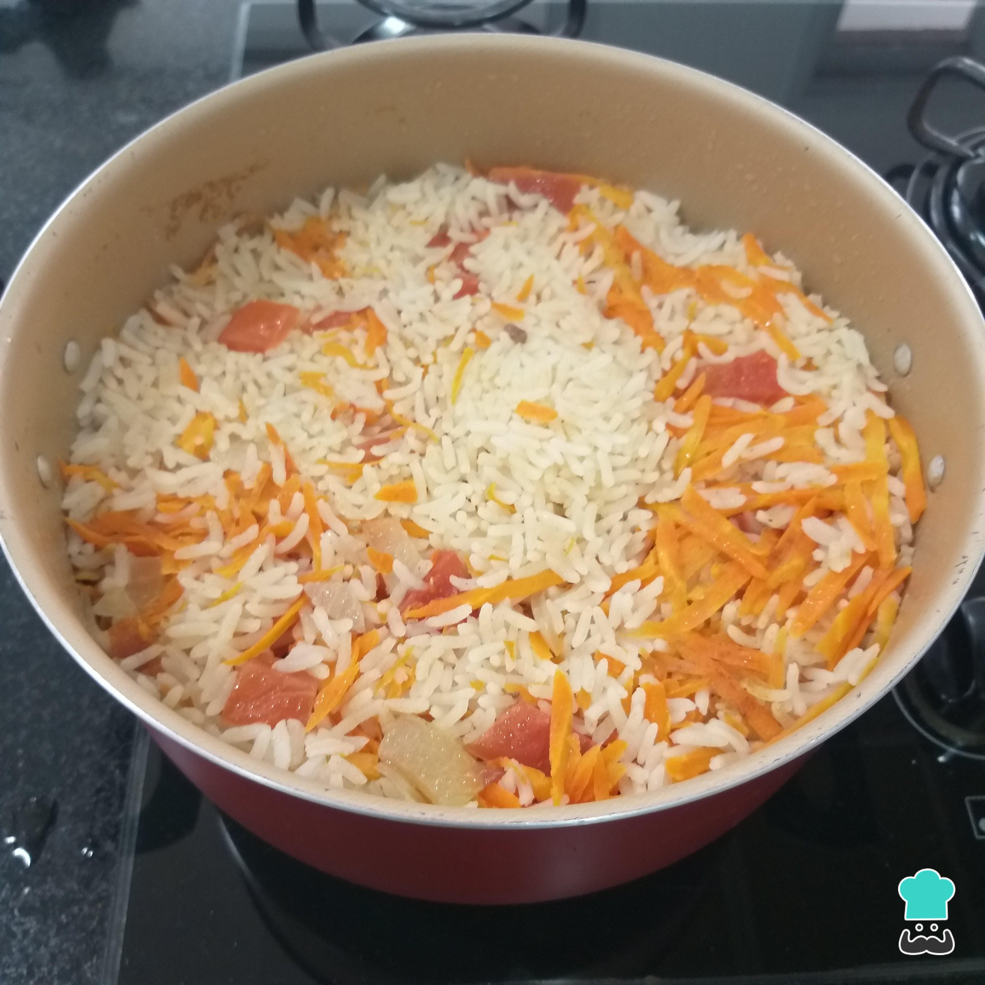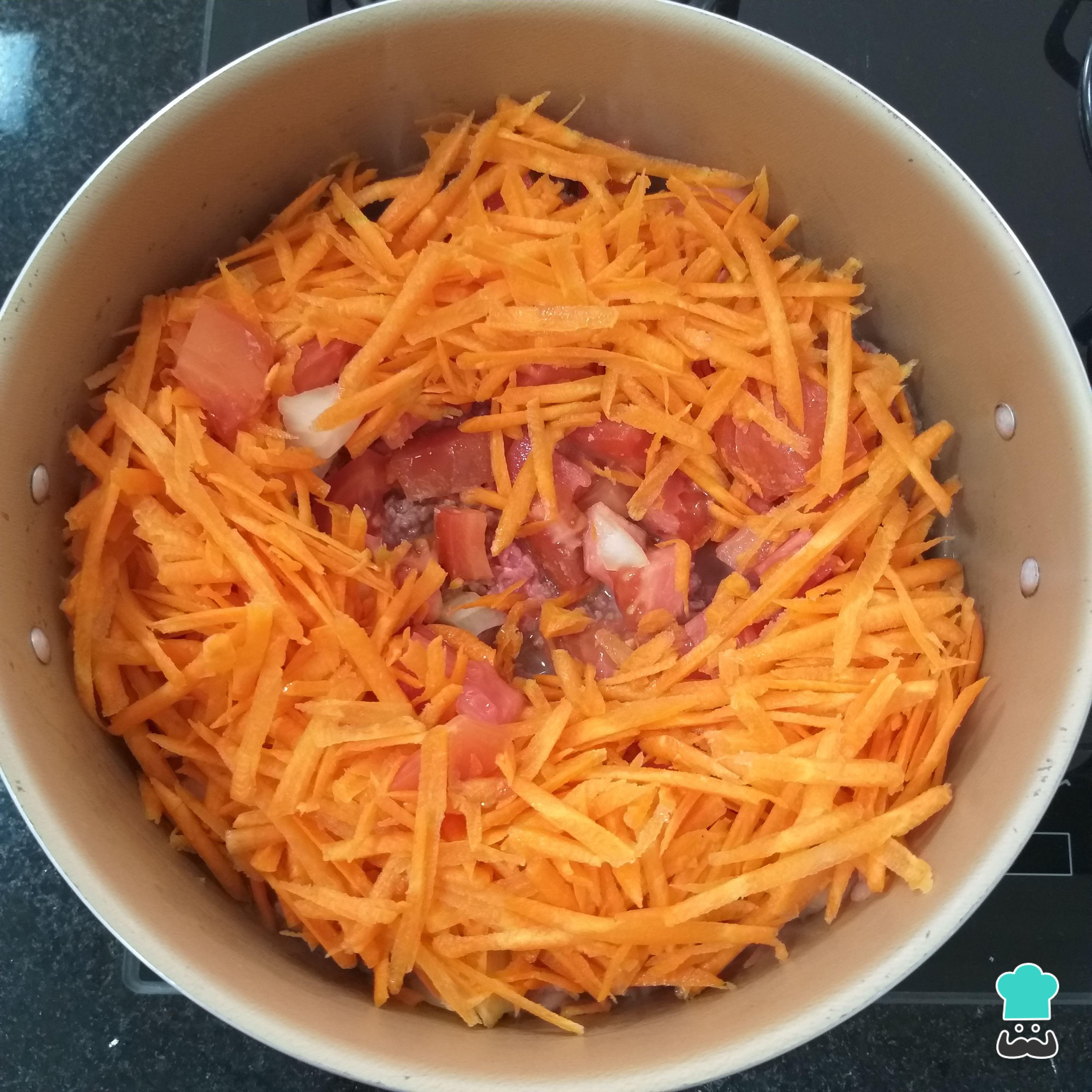 Para conferir mais cor e sabor no seu arroz de barranco com carne moída, em seguida acrescente a cenoura e o tomate e polvilhe um pouco de sal.