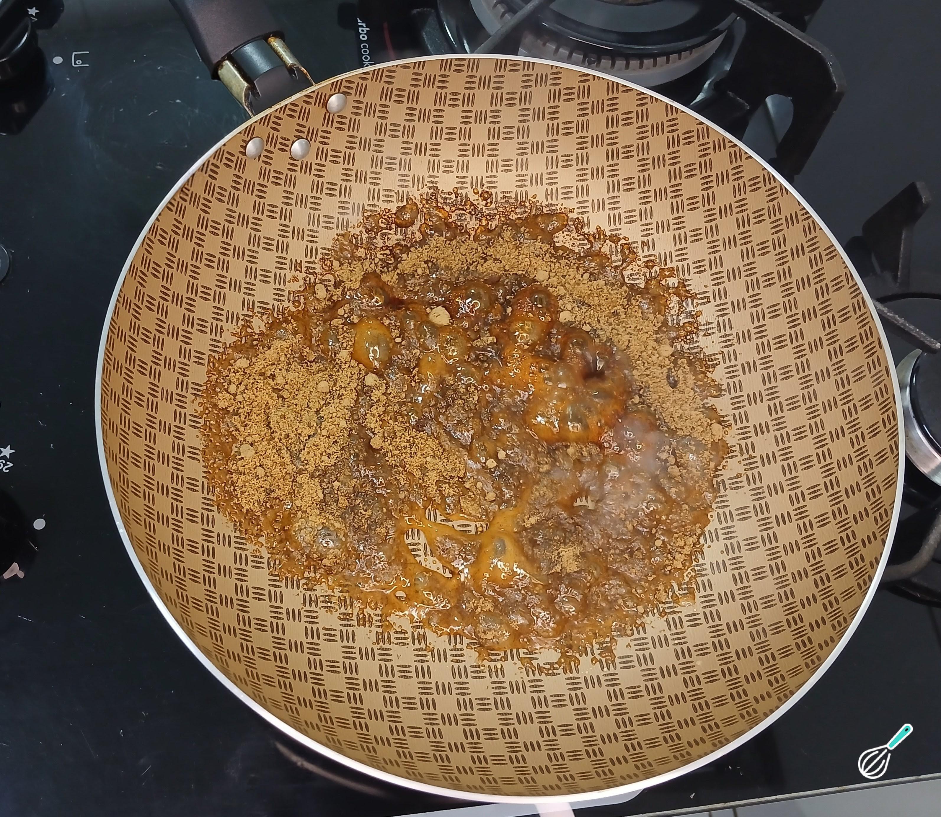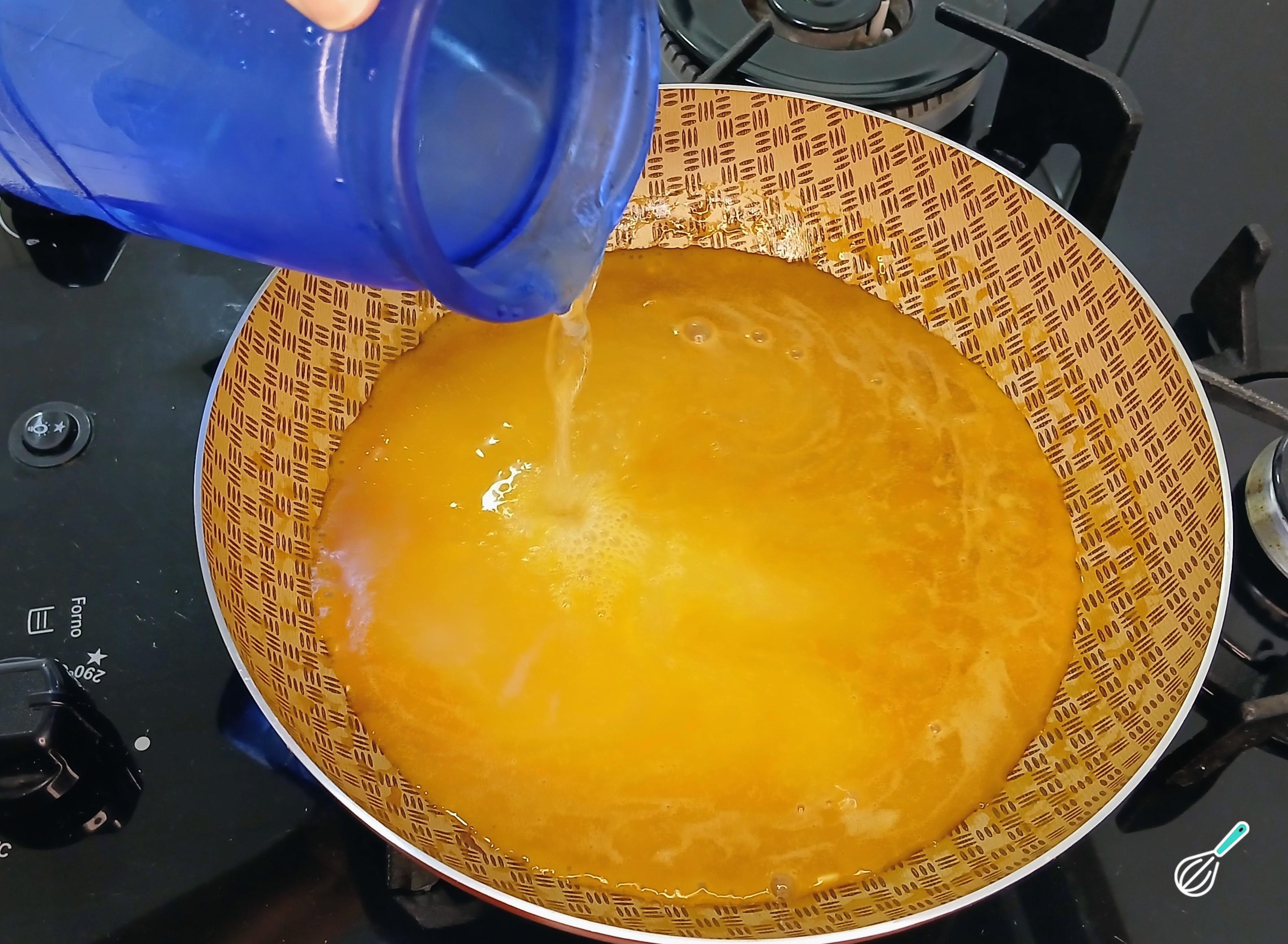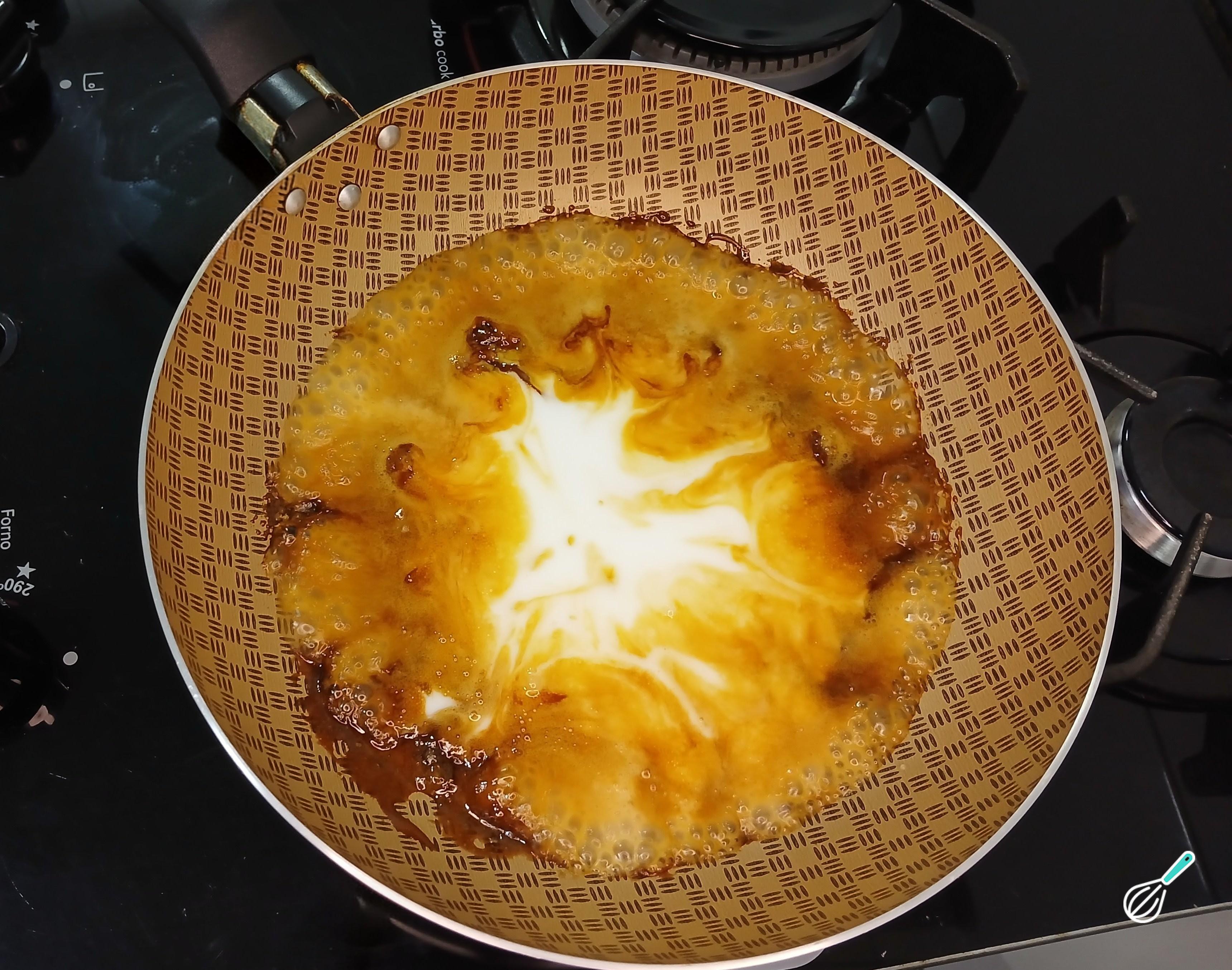 Em uma panela média, coloque o açúcar mascavo para caramelizar. Cuidado pois ele queima rápido, mexa sempre para evitar que grude no fundo e mantenha o fogo baixo.