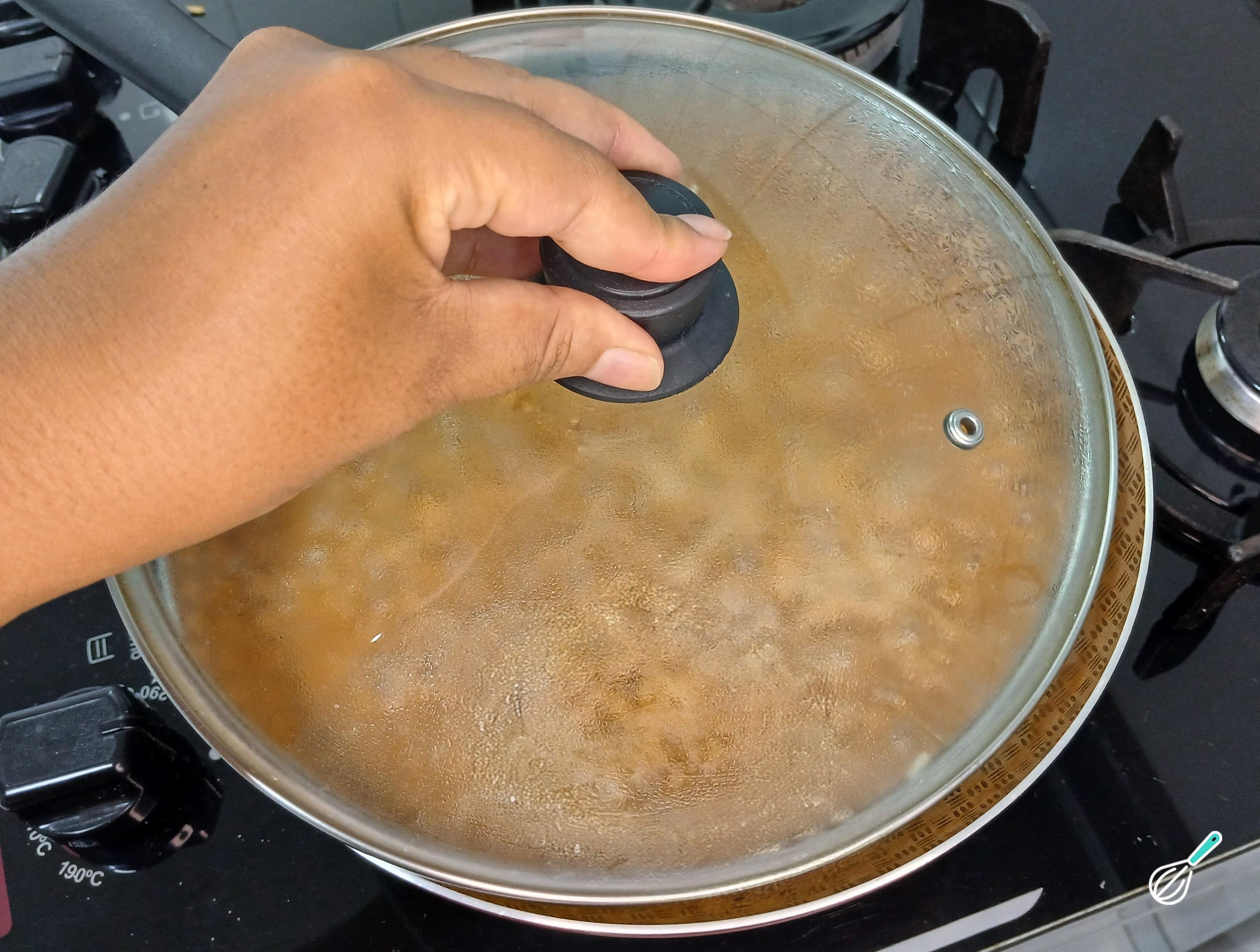 Assim que adicionar a segunda água, tampe parcialmente a panela para que o arroz continue e cozinhar e assim ficar totalmente macio. Assim que estiver cozido, desligue o fogo e deixe ficar morno, depois solte o arroz com o auxílio de um garfo.