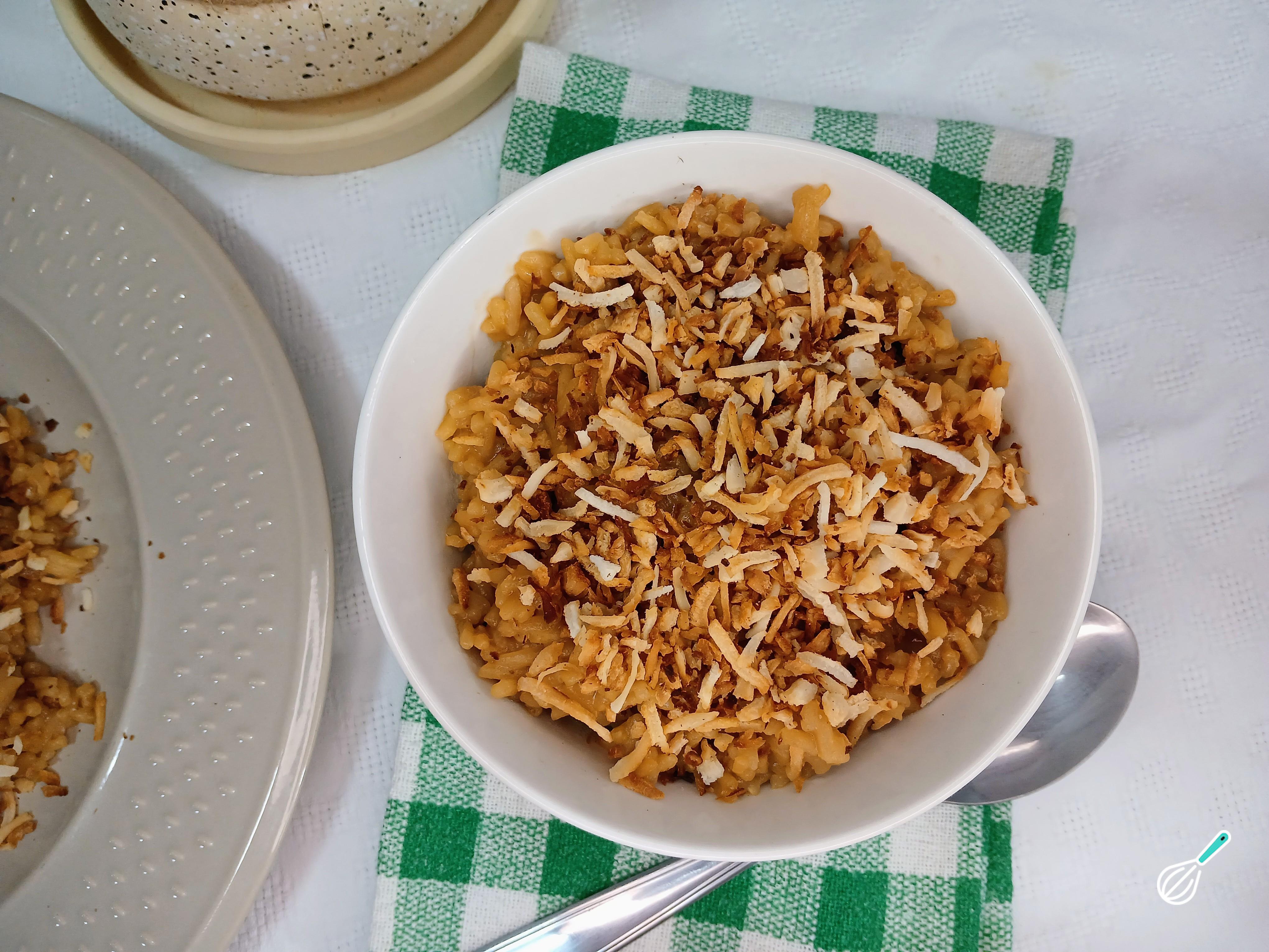 Feito isso, em uma panela pequena toste o coco ralado para decorar o prato. Cuidado para não queimar e mexa sempre até que toste. Em seguida coloque o coco tostado por cima do arroz de coco e sirva.