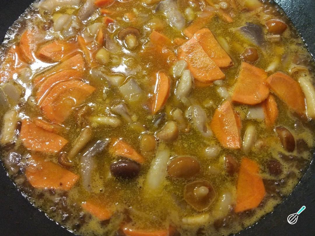 No wok ou frigideira grande coloque o azeite, o alho e a cebola e deixe refogar. Quando dourar, adicione a cenoura e os cogumelos. Envolva tudo e deixe refogar até que os cogumelos soltem os seus sucos.