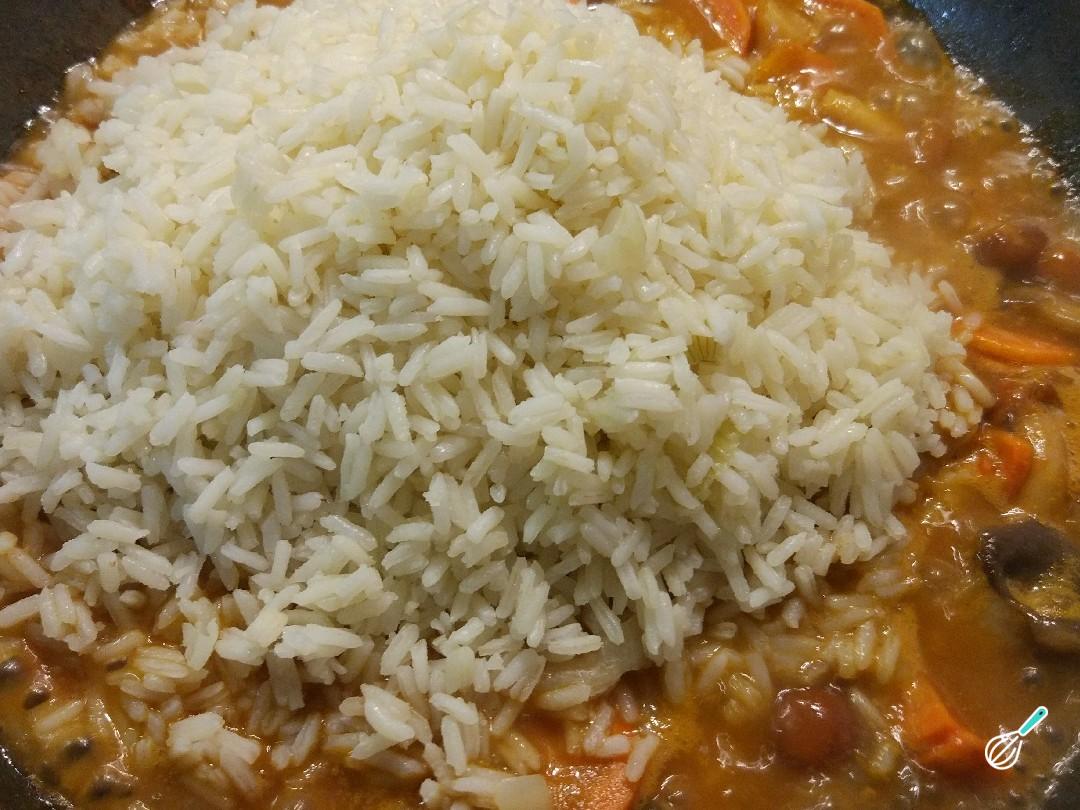 Adicione o arroz cozido, envolva tudo e desligue o fogo.