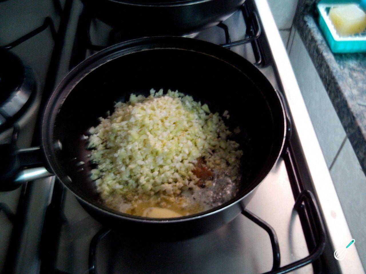 Depois, em uma panela, refogue a cebola na manteiga e até ficar macia. Junte a couve-flor e misture.