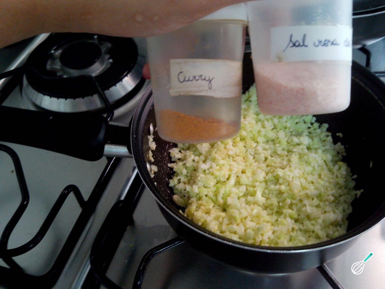 Por fim coloque o sal e o curry. Prove e, se sentir que a couve-flor ainda está crua, cozinhe por mais uns minutinhos.