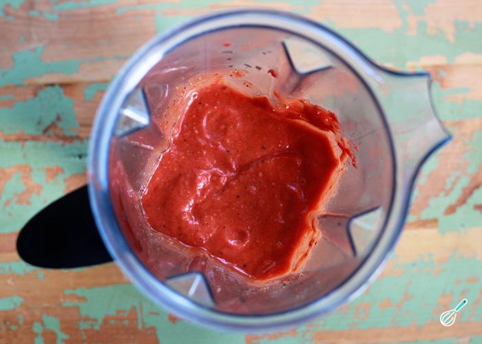 Para fazer arroz de forno à parmegiana, comece por colocar os tomates sem pele, um tablete de caldo de galinha dissolvido em água quente, o extrato de tomate e um pouco de água no liquidificador. Bata bem a mistura.